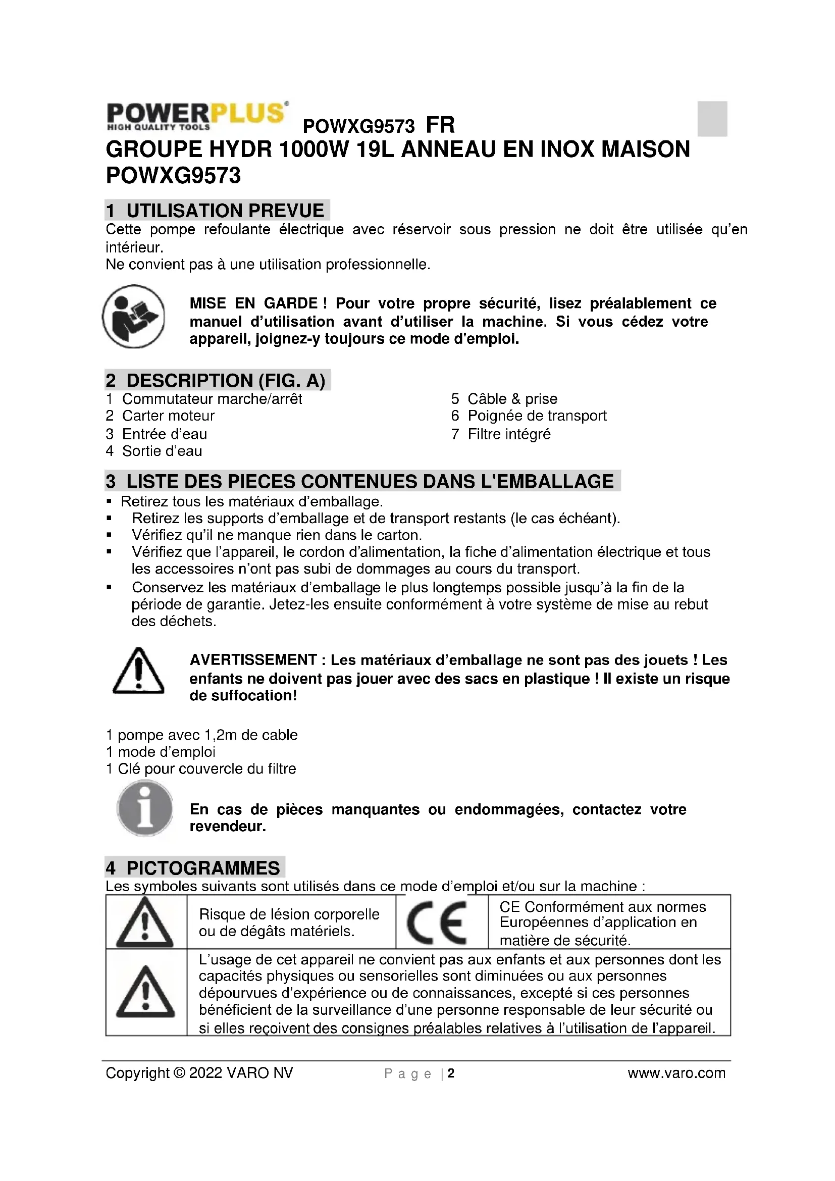 Copyright © 2022 VARO NV P a g e | 2 www.varo.com GROUPE HYDR 1000W 19L ANNEAU EN INOX MAISON POWXG9573 1 UTILISATION PREVUE Cette pompe refoulante électrique avec réservoir sous pression ne doit être utilisée qu’en intérieur. Ne convient pas à une utilisation professionnelle. MISE EN GARDE ! Pour votre propre sécurité, lisez préalablement ce manuel d’utilisation avant d’utiliser la machine. Si vous cédez votre appareil, joignez-y toujours ce mode d'emploi. 2 DESCRIPTION (FIG. A) 1 Commutateur marche/arrêt 2 Carter moteur 3 Entrée d’eau 4 Sortie d’eau 5 Câble & prise 6 Poignée de transport 7 Filtre intégré
