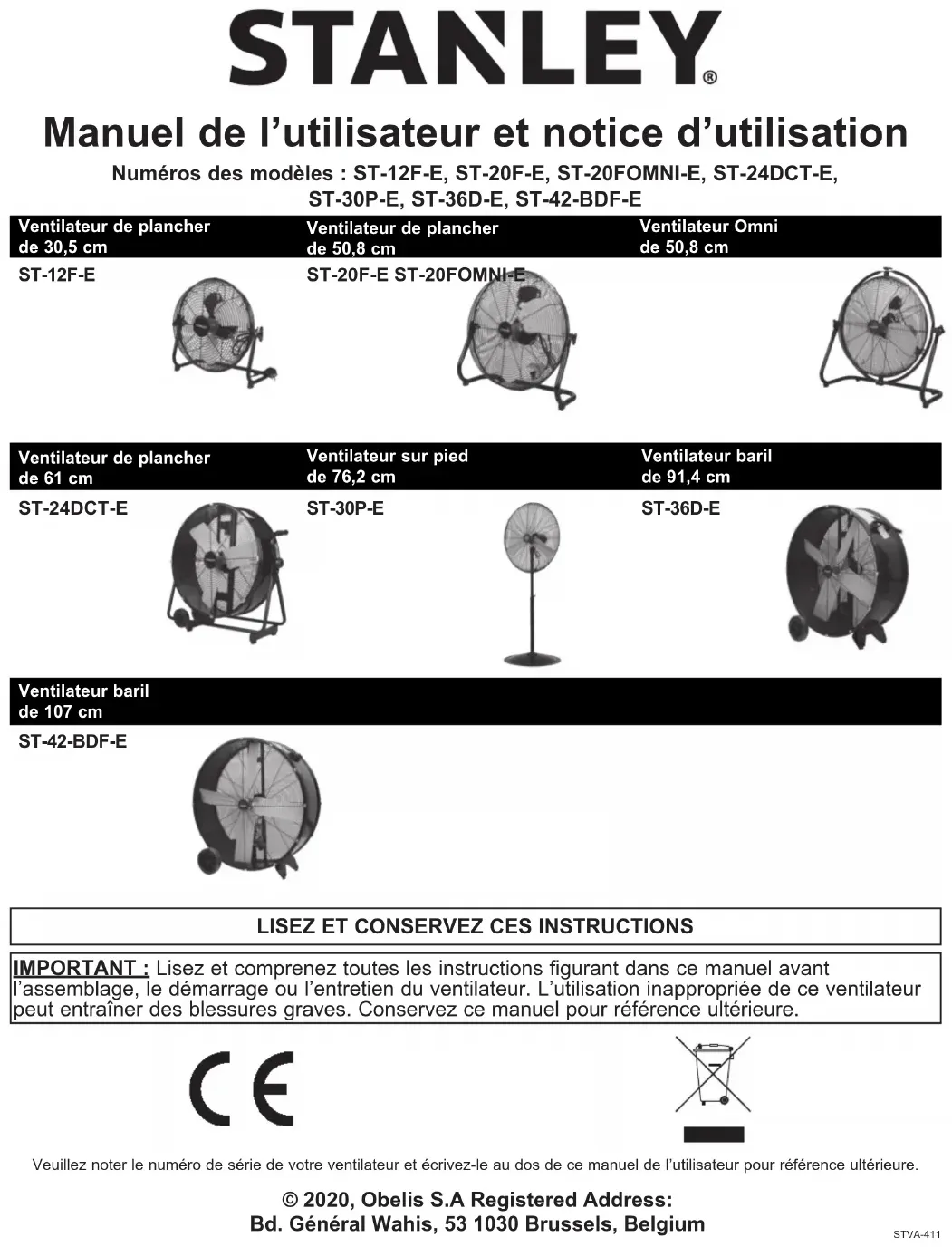 Manuel de l’utilisateur et notice d’utilisation Ventilateur de plancher de 50,8 cm Ventilateur Omni de 50,8 cm Ventilateur sur pied de 76,2 cm © 2020, Obelis S.A Registered Address: Bd. Général Wahis, 53 1030 Brussels, Belgium Ventilateur de plancher de 61 cm Ventilateur baril de 91,4 cm STVA-411 ST-12F-E
