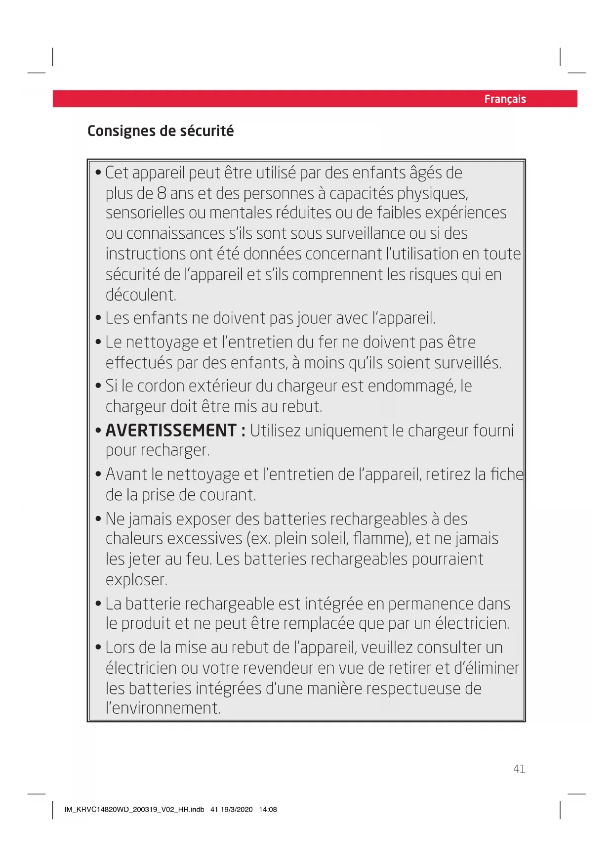 - Lors de la mise au rebut de l’appareil, veuillez consulter un électricien ou votre revendeur en vue de retirer et d’éliminer les batteries intégrées d’une manière respectueuse de l’environnement. IM_KRVC14820WD_200319_V02_HR.indb 41 19/3/2020 14:08Français