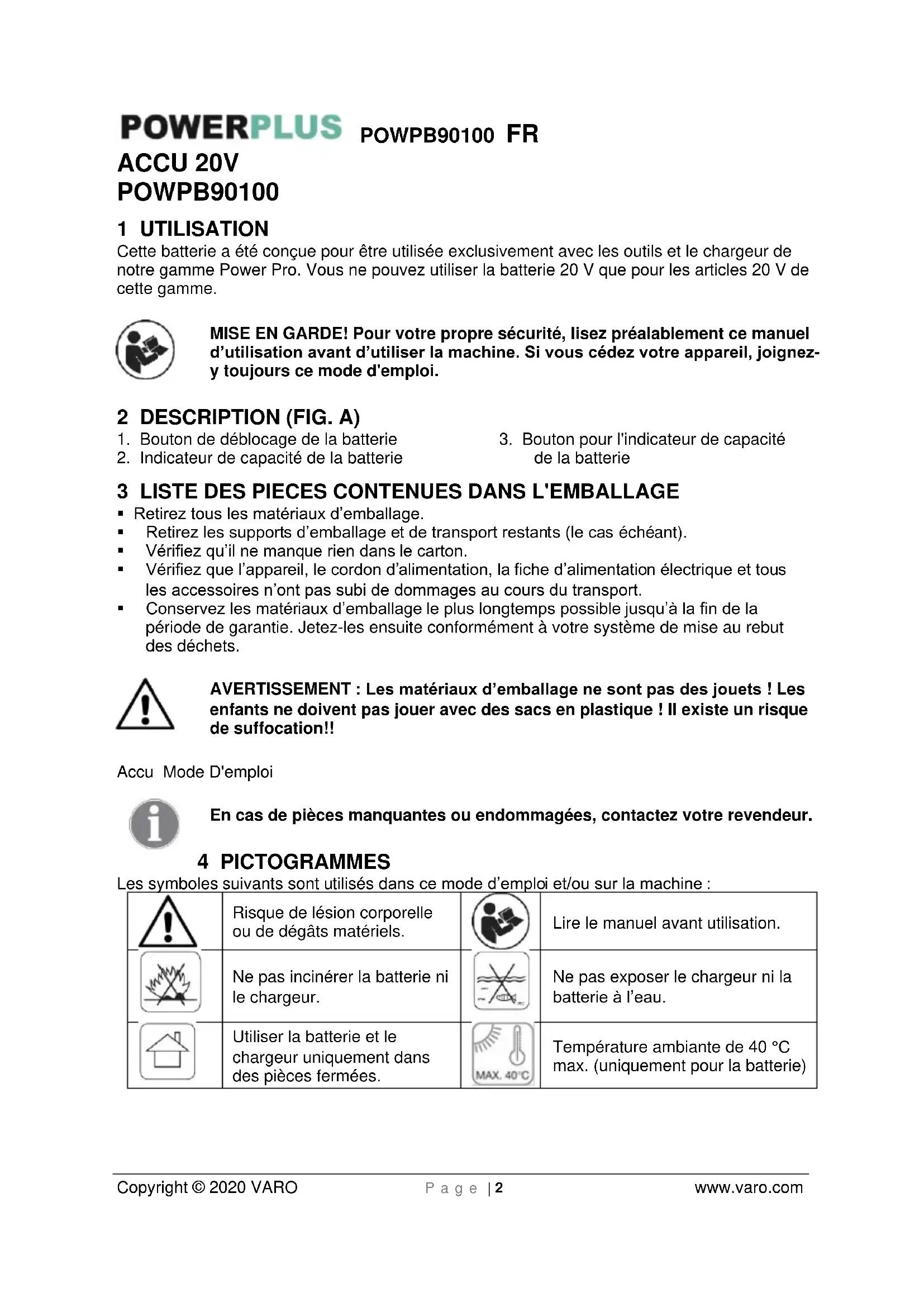 Copyright © 2020 VARO P a g e | 2 www.varo.com ACCU 20V POWPB90100 1 UTILISATION Cette batterie a été conçue pour être utilisée exclusivement avec les outils et le chargeur de notre gamme Power Pro. Vous ne pouvez utiliser la batterie 20 V que pour les articles 20 V de cette gamme. MISE EN GARDE! Pour votre propre sécurité, lisez préalablement ce manuel d’utilisation avant d’utiliser la machine. Si vous cédez votre appareil, joignez- y toujours ce mode d'emploi. 2 DESCRIPTION (FIG. A)