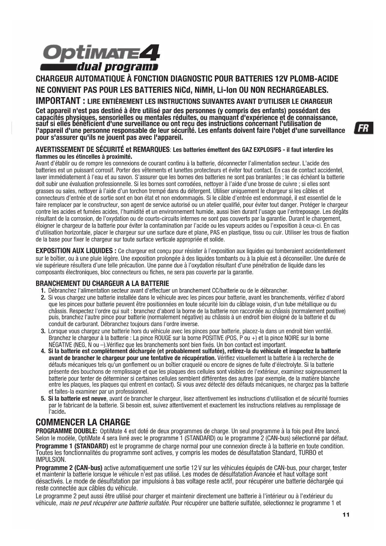 dual program CHARGEUR AUTOMATIQUE À FONCTION DIAGNOSTIC POUR BATTERIES 12V PLOMB-ACIDE NE CONVIENT PAS POUR LES BATTERIES NiCd, NiMH, Li-Ion OU NON RECHARGEABLES. IMPORTANT : LIRE ENTIÈREMENT LES INSTRUCTIONS SUIVANTES AVANT D’UTILISER LE CHARGEUR Cet appareil n'est pas destiné à être utilisé par des personnes (y compris des enfants) possédant des capacités physiques, sensorielles ou mentales réduites, ou manquant d'expérience et de connaissance, sauf si elles bénéficient d'une surveillance ou ont reçu des instructions concernant l'utilisation de l'appareil d'une personne responsable de leur sécurité. Les enfants doivent faire l'objet d'une surveillance pour s'assurer qu'ils ne jouent pas avec l'appareil. AVERTISSEMENT DE SÉCURITÉ et REMARQUES: Les batteries émettent des GAZ EXPLOSIFS - il faut interdire les flammes ou les étincelles à proximité. Avant d’établir ou de rompre les connexions de courant continu à la batterie, déconnecter l’alimentation secteur. L’acide des batteries est un puissant corrosif. Porter des vêtements et lunettes protecteurs et éviter tout contact. En cas de contact accidentel, laver immédiatement à l’eau et au savon. S’assurer que les bornes des batteries ne sont pas branlantes ; le cas échéant la batterie doit subir une évaluation professionnelle. Si les bornes sont corrodées, nettoyer à l’aide d’une brosse de cuivre ; si elles sont grasses ou sales, nettoyer à l’aide d’un torchon trempé dans du détergent. Utiliser uniquement le chargeur si les câbles et connecteurs d’entrée et de sortie sont en bon état et non endommagés. Si le câble d’entrée est endommagé, il est essentiel de le faire remplacer par le constructeur, son agent de service autorisé ou un atelier qualifié, pour éviter tout danger. Protéger le chargeur contre les acides et fumées acides, l’humidité et un environnement humide, aussi bien durant l’usage que l’entreposage. Les dégâts résultant de la corrosion, de l’oxydation ou de courts-circuits internes ne sont pas couverts par la garantie. Durant le chargement, éloigner le chargeur de la batterie pour éviter la contamination par l’acide ou les vapeurs acides ou l’exposition à ceux-ci. En cas d’utilisation horizontale, placer le chargeur sur une surface dure et plane, PAS en plastique, tissu ou cuir. Utiliser les trous de fixation de la base pour fixer le chargeur sur toute surface verticale appropriée et solide. EXPOSITION AUX LIQUIDES : Ce chargeur est conçu pour résister à l’exposition aux liquides qui tomberaient accidentellement sur le boîtier, ou à une pluie légère. Une exposition prolongée à des liquides tombants ou à la pluie est à déconseiller. Une durée de vie supérieure résultera d’une telle précaution. Une panne due à l’oxydation résultant d’une pénétration de liquide dans les composants électroniques,bloc connecteurs ou fiches,ne sera pas couverte par la garantie.BRANCHEMENT DU CHARGEUR A LA BATTERIE