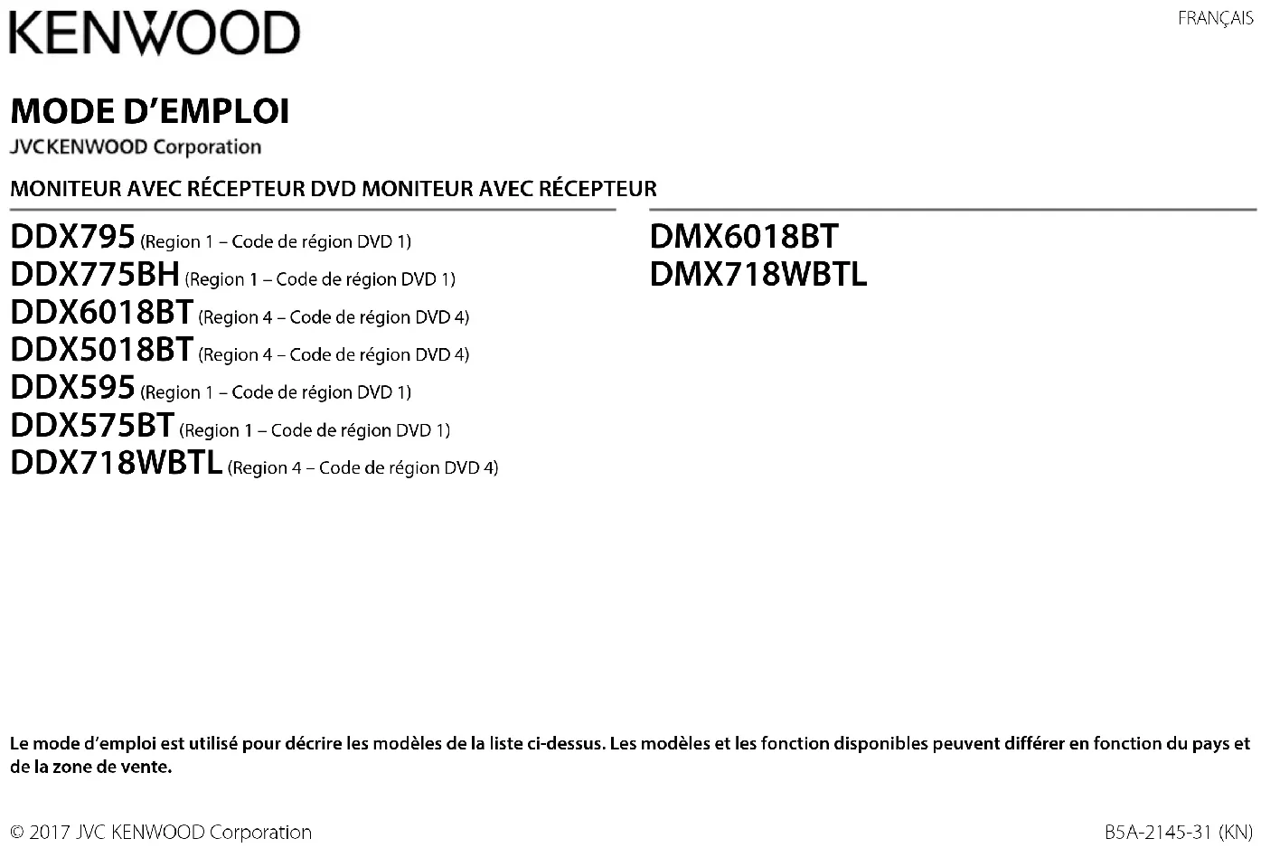 DDX795 (Region 1 – Code de région DVD 1) DDX775BH (Region 1 – Code de région DVD 1) DDX6018BT (Region 4 – Code de région DVD 4) DDX5018BT (Region 4 – Code de région DVD 4) DDX595 (Region 1 – Code de région DVD 1) DDX575BT (Region 1 – Code de région DVD 1) DDX718WBTL (Region 4 – Code de région DVD 4) B5A-2145-31 (KN) FRANÇAIS Le mode d’emploi est utilisé pour décrire les modèles de la liste ci-dessus. Les modèles et les fonction disponibles peuvent différer en fonction du pays et de la zone de vente. © 2017 JVC KENWOOD Corporation DMX6018BT DMX718WBTL MONITEUR AVEC RÉCEPTEUR DVD MONITEUR AVEC RÉCEPTEUR