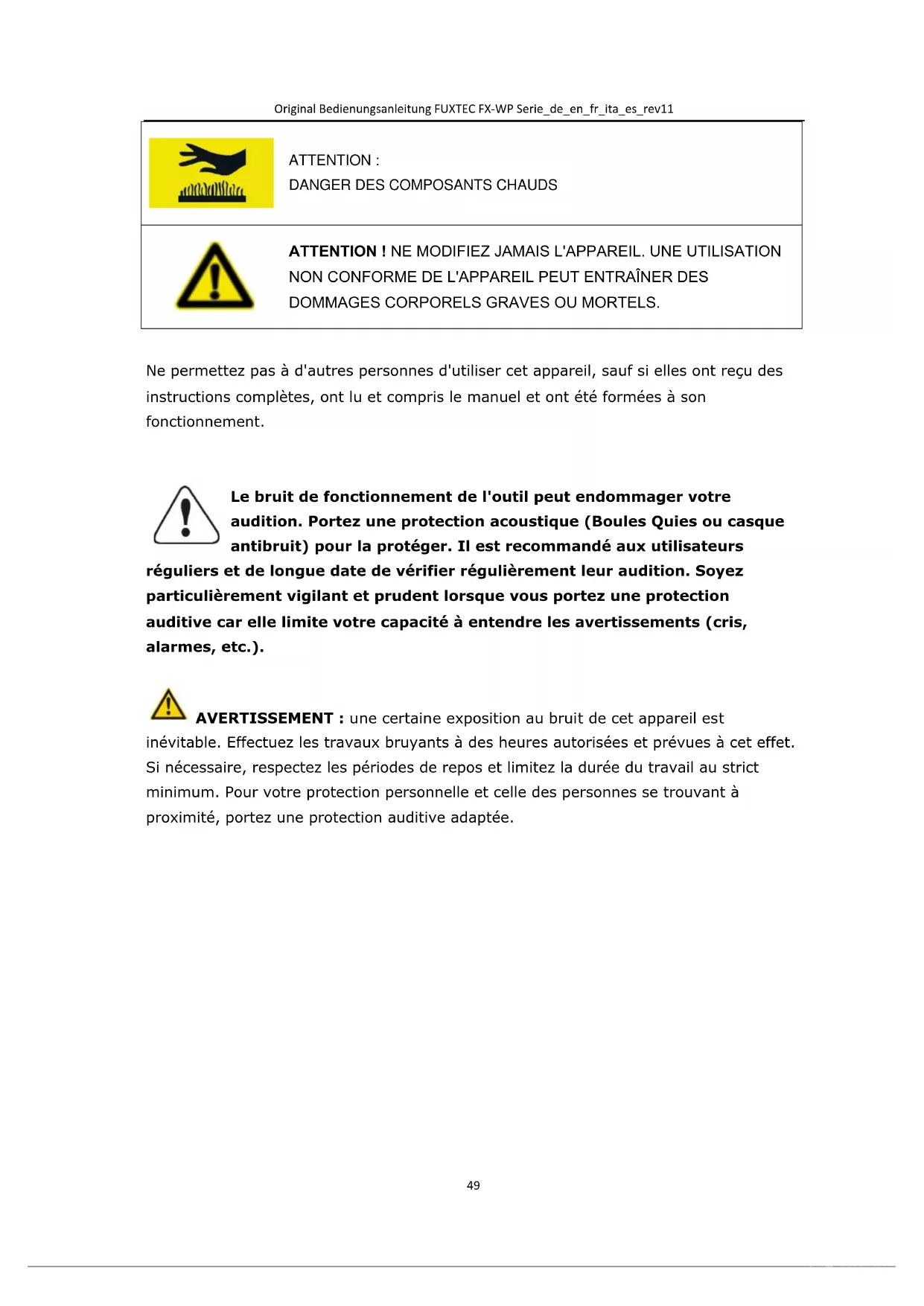 inévitable. Effectuez les travaux bruyants à des heures autorisées et prévues à cet effet. Si nécessaire, respectez les périodes de repos et limitez la durée du travail au strict minimum. Pour votre protection personnelle et celle des personnes se trouvant à proximité, portez une protection auditive adaptée.Original Bedienungsanleitung FUXTEC FX-WP Serie_de_en_fr_ita_es_rev11