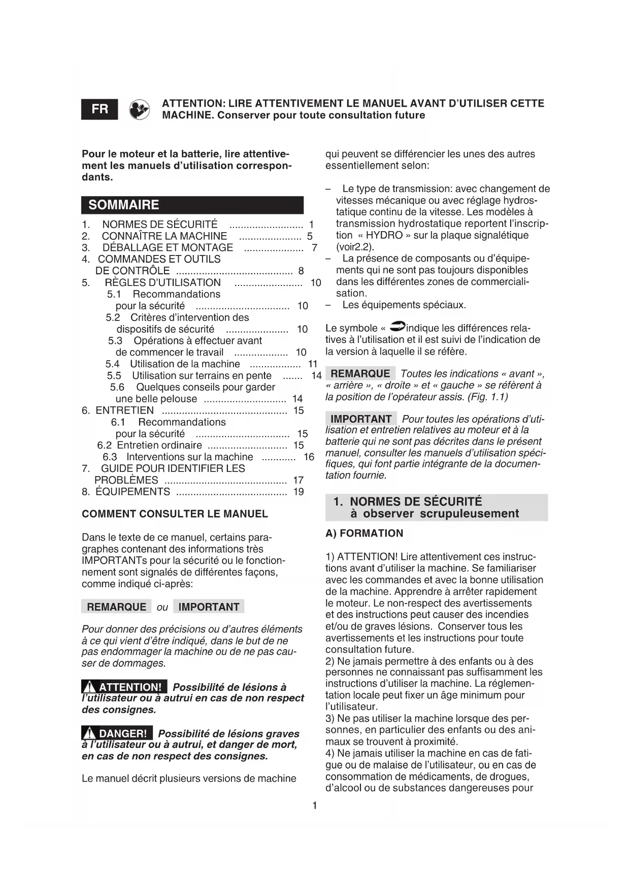 ATTENTION: LIRE ATTENTIVEMENT LE MANUEL AVANT D’UTILISER CETTE MACHINE. Conserver pour toute consultation future Pour le moteur et la batterie, lire attentive- ment les manuels d’utilisation correspon- dants. SOMMAIRE