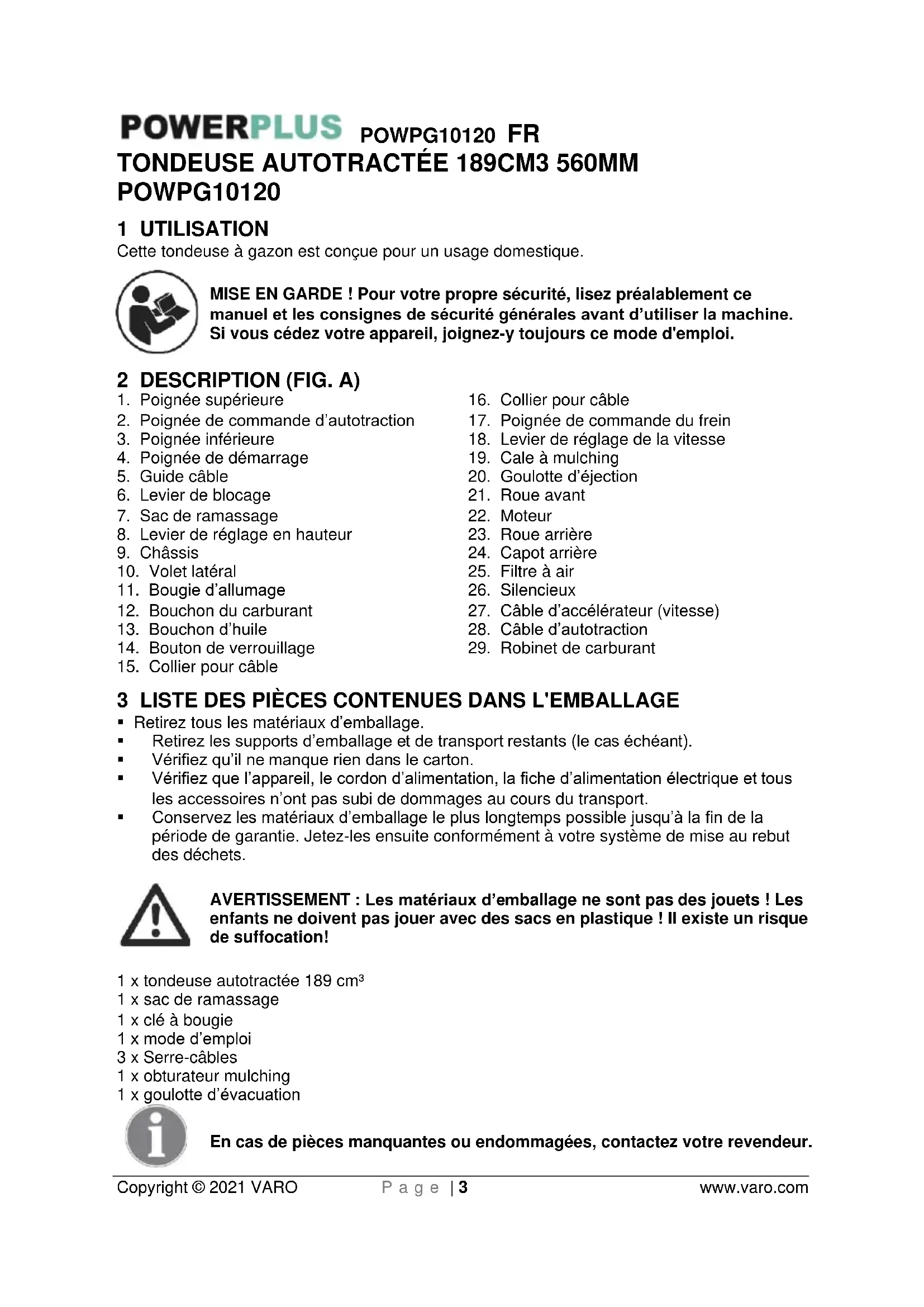 enfants ne doivent pas jouer avec des sacs en plastique ! Il existe un risque de suffocation! 1 x tondeuse autotractée 189 cm³ 1 x sac de ramassage 1 x clé à bougie 1 x mode d’emploi 3 x Serre-câbles 1 x obturateur mulching 1 x goulotte d’évacuation En cas de pièces manquantes ou endommagées, contactez votre revendeur.POWPG10120 FR Copyright © 2021 VARO P a g e | 4 www.varo.com 4 PICTOGRAMMES Les symboles suivants sont utilisés dans ce mode d’emploi et/ou sur la machine:
