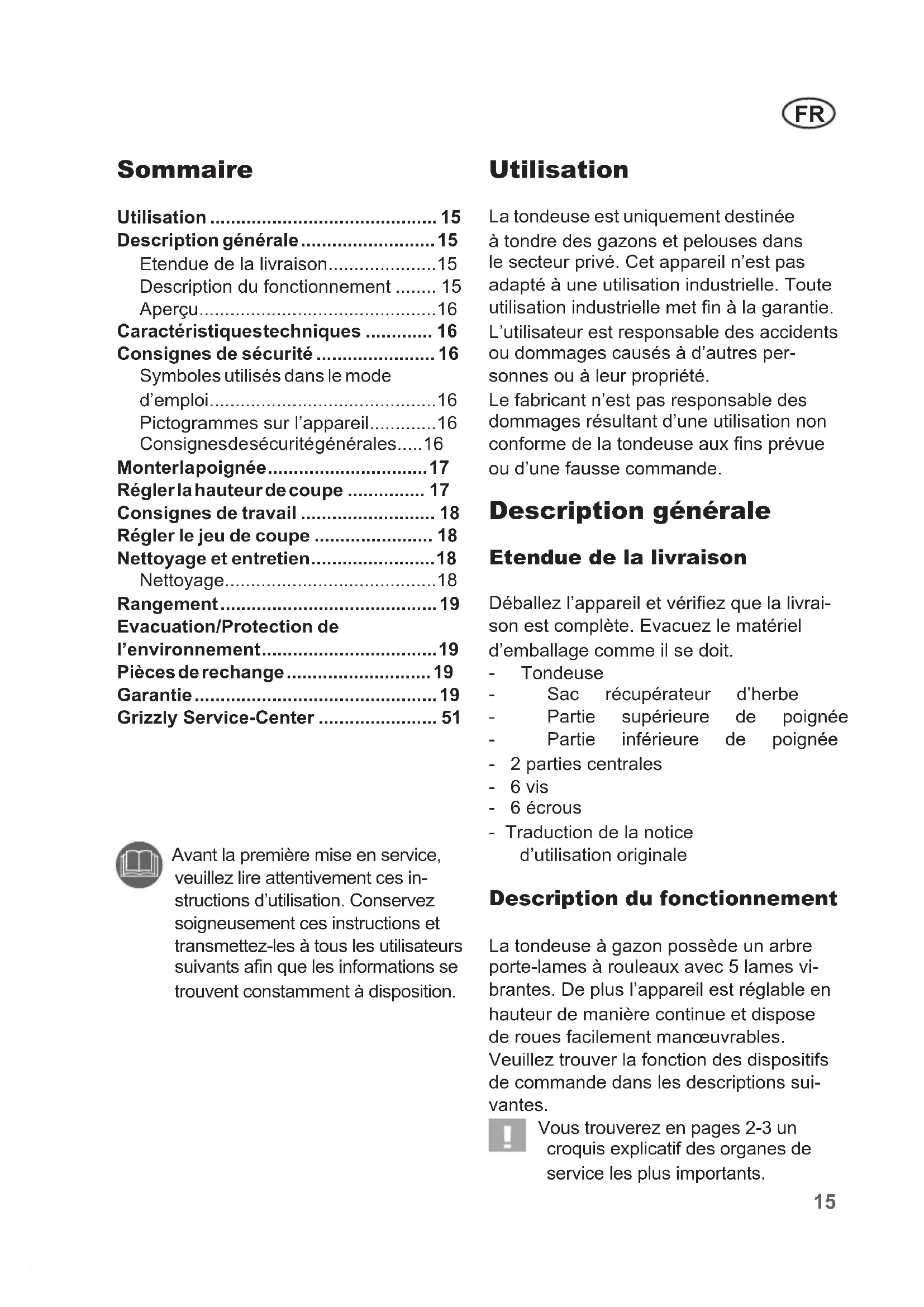 - Utilisation La tondeuse est uniquement destinée à tondre des gazons et pelouses dans le secteur privé. Cet appareil n’est pas adapté à une utilisation industrielle. Toute utilisation industrielle met n à la garantie. L’utilisateur est responsable des accidents ou dommages causés à d’autres per- sonnes ou à leur propriété. Le fabricant n’est pas responsable des dommages résultant d’une utilisation non conforme de la tondeuse aux ns prévue ou d’une fausse commande. Description générale Etendue de la livraison Déballez l’appareil et vériez que la livrai- son est complète. Evacuez le matériel d’emballage comme il se doit. - Tondeuse - Sac récupérateur d’herbe - Partie supérieure de poignée - Partie inférieure de poignée - 2 parties centrales - 6 vis - 6 écrous - Traduction de la notice d’utilisation originale Description du fonctionnement La tondeuse à gazon possède un arbre porte-lames à rouleaux avec 5 lames vi- brantes. De plus l’appareil est réglable en hauteur de manière continue et dispose de roues facilement manœuvrables. Veuillez trouver la fonction des dispositifs de commande dans les descriptions sui- vantes. Vous trouverez en pages 2-3 un croquis explicatif des organes de service les plus importants. Avant la première mise en service, veuillez lire attentivement ces in- structions d’utilisation. Conservez soigneusement ces instructions et transmettez-les à tous les utilisateurs suivants an que les informations se trouvent constamment à disposition. Grizzly Service-Center p. 5116