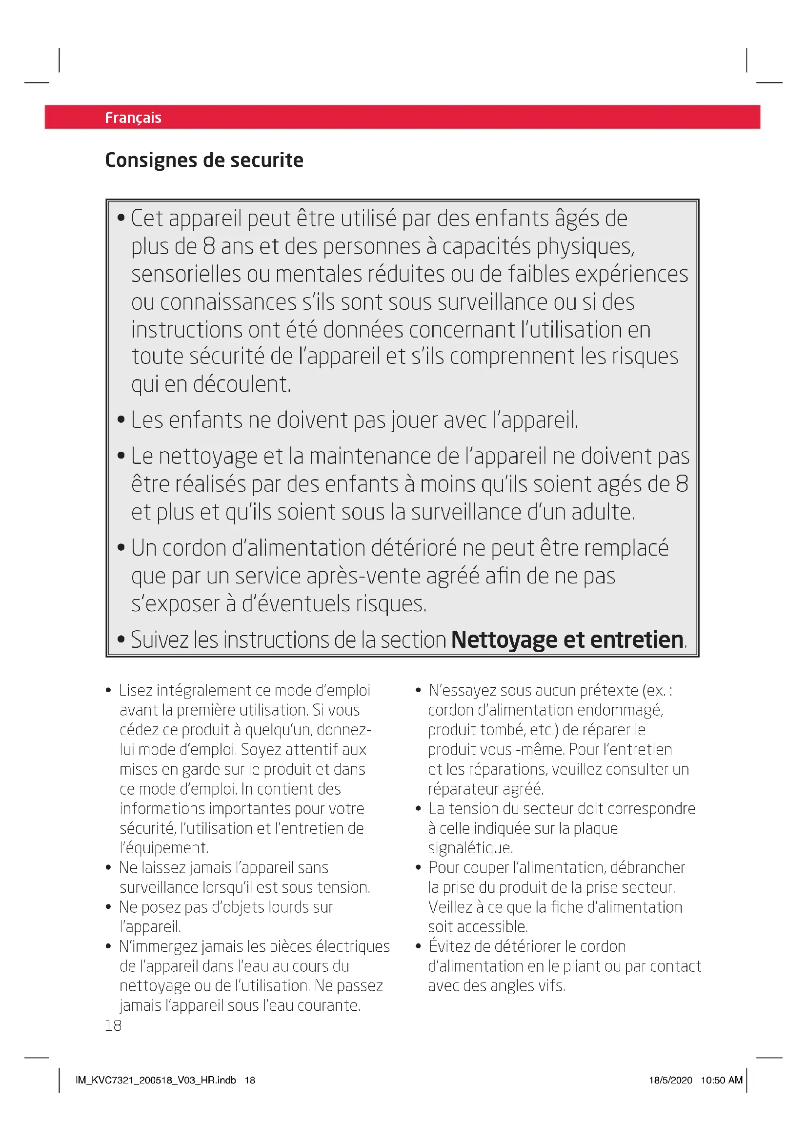 - Évitez de détériorer le cordon d’alimentation en le pliant ou par contact avec des angles vifs. IM_KVC7321_200518_V03_HR.indb 18IM_KVC7321_200518_V03_HR.indb 18 18/5/2020 10:50 AM18/5/2020 10:50 AMFrançais