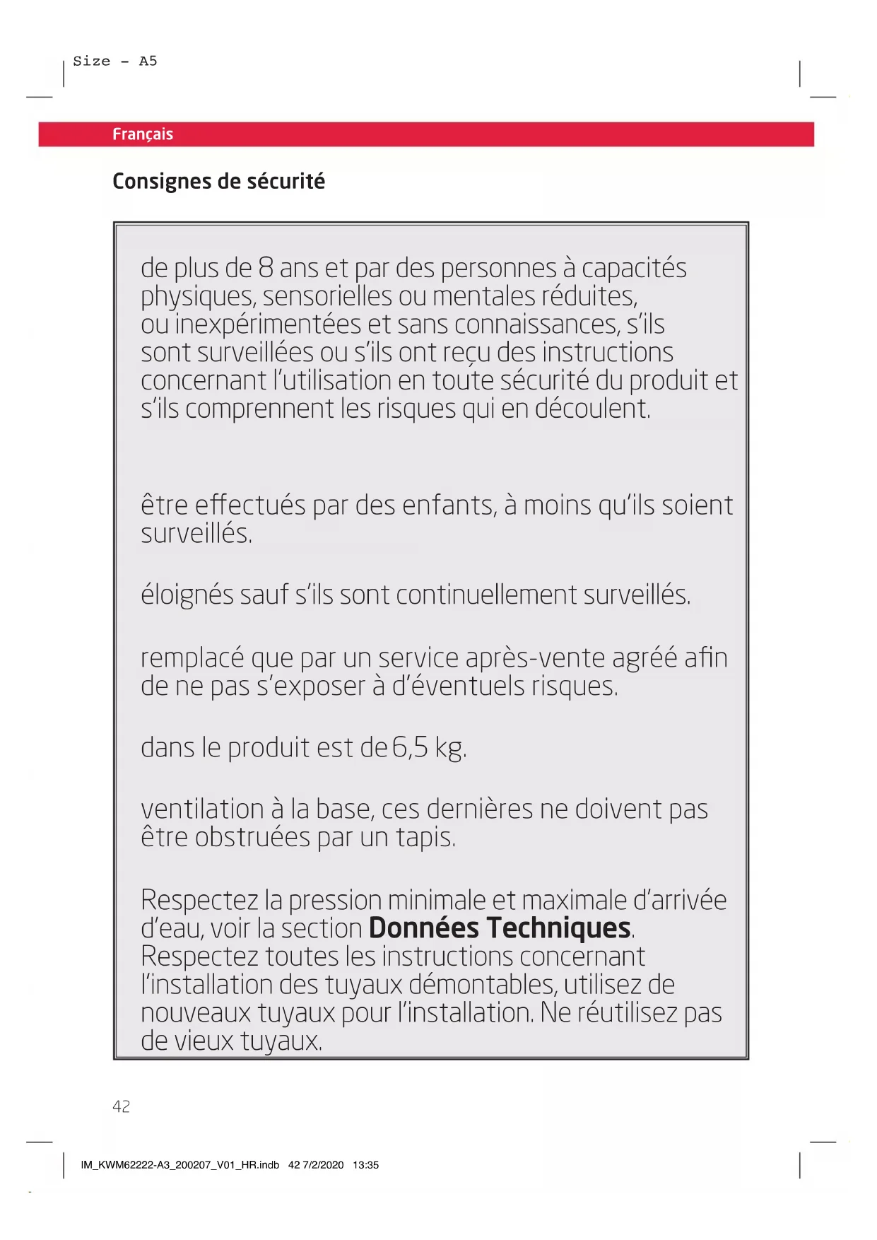 - Cet appareil es branché à l’alimentation d’eau. Respectez la pression minimale et maximale d’arrivée d’eau, voir la section Données Techniques. Respectez toutes les instructions concernant l’installation des tuyaux démontables, utilisez de nouveaux tuyaux pour l’installation. Ne réutilisez pas de vieux tuyaux. IM_KWM62222-A3_200207_V01_HR.indb 42 7/2/2020 13:35Français