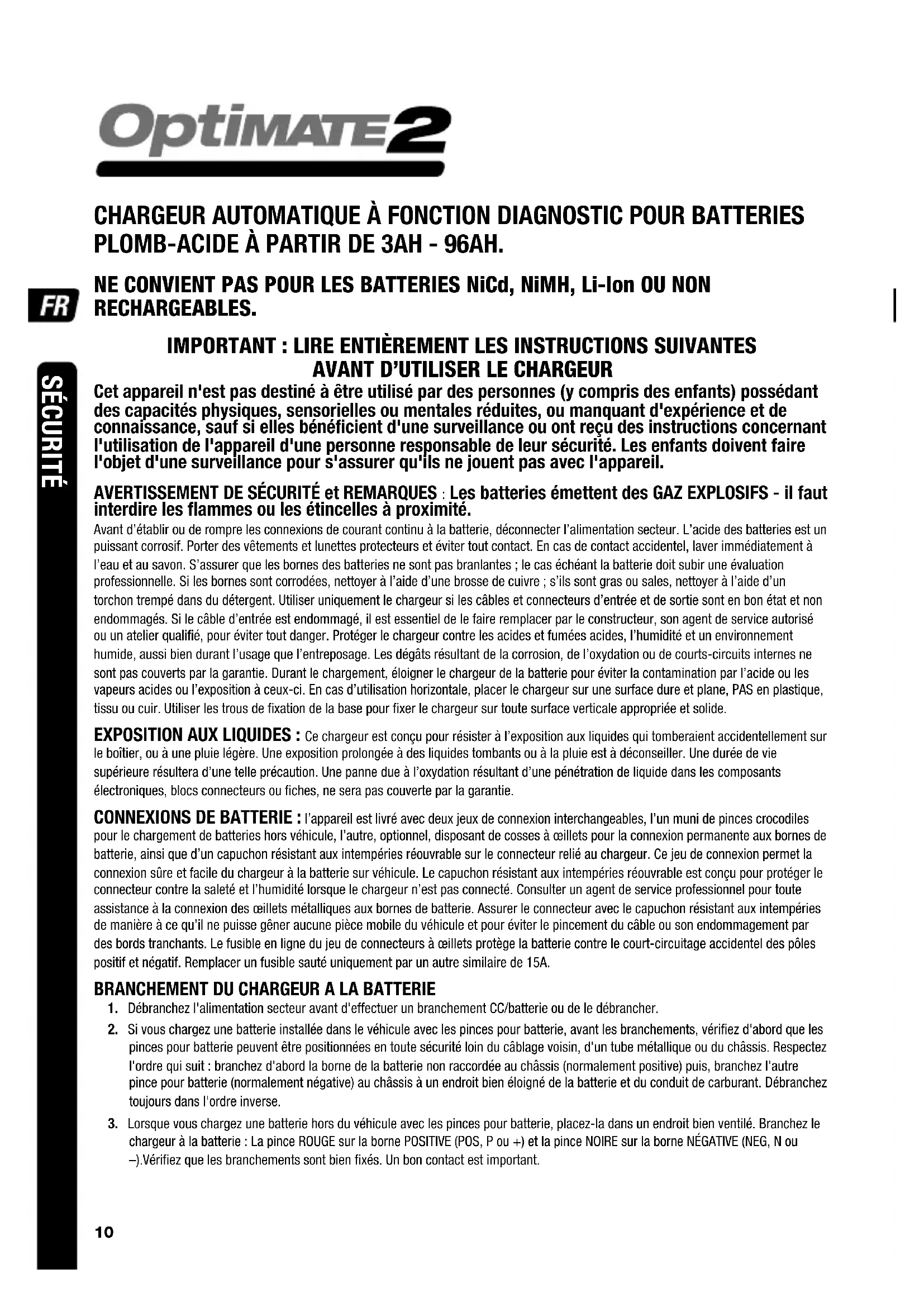 décharge. La batterie prend le courant nécessaire pour compenser les pertes et consommations. Les périodes de test (PAS DE CHARGE DE COURANT) et d’entretien continuent d’alterner toutes les 1/2h jusqu’à déconnexion. Si le voltage de la batterie tombe en dessous de 12.4 V, le programme revient à l'étape 3.3. Maintenance d’une batterie durant des périodes prolongées : L'OptiMate maintiendra une batterie dont l'état est bon, en toute sécurité durant plusieurs mois. Vérifier au moins une fois par quinzaine la sécurité des connexions entre chargeur et batterie. Dans le cas de batteries équipées de bouchons de remplissage sur chaque cellule, déconnecter la batterie du chargeur, vérifier le niveau d’électrolyte et faire l’appoint si nécessaire (en eau distillée, PAS en acide), puis reconnecter. Lors de la manipulation de batteries ou à proximité de celles-ci, toujours respecter les AVERTISSEMENTS DE SÉCURITÉ ci-dessus. Temps de charge : Le temps requis par l’OptiMate 3 si la batterie est déchargée mais toutefois en bon état, est environ égal à la capacité de la batterie en Ah. Il faudra donc à peu près 10 heures pour qu’une batterie de 10Ah soit amenée à l'étape 4. Les batteries en état de décharge profonde peuvent prendre beaucoup plus de temps.