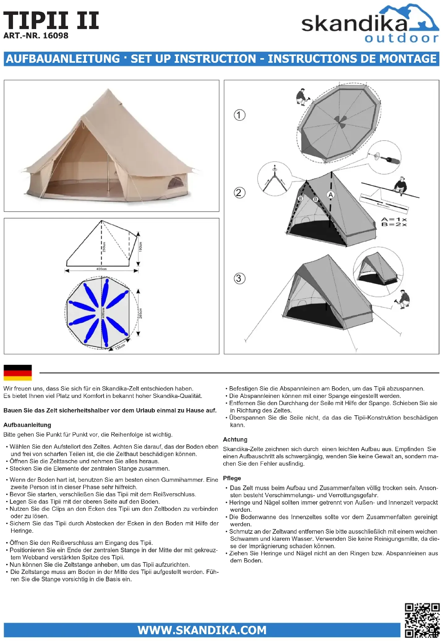 - Ne pas tirer sur les cordes d’ancrage pour extraire les sardines et pointes du sol. TIPII II ART.-NR. 16098 AUFBAUANLEITUNG · SET UP INSTRUCTION - INSTRUCTIONS DE MONTAGE