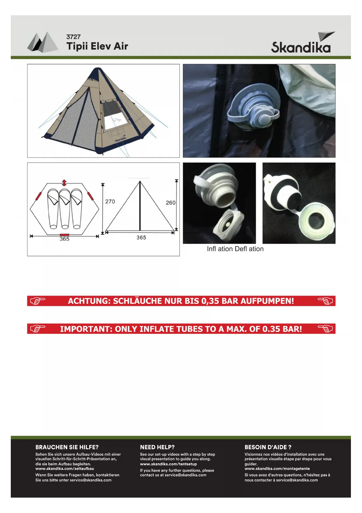 - Tendez convenablement le tapis de sol et xez une sardine à chaque coin.• Ouvrez la valve sur le premier conduit d’air (cf. Image „In ation“) et reliez la valve avec l’adaptateur de la pompe à air.• Gon ez le conduit complètement, et retirez la pompe et refermez la valve.• Fixez les cordes sur les points d’ancrage et tendez-les à distance convenable de la tente.• Lors du démontage de la tente, ouvrez les valves (cf. Image „De ation“), pour que l’air s’échappe. IMPORTANT Si vous avez des di cultés à n‘importe quelle éta-pe, veuillez consulter notre page vidéo de montage de tente ci-dessous qui donne des images et des con-seils pour chaque étape. Si toutefois quelque chose n‘est toujours pas clair, n‘hésitez pas à nous contacter àservice@skandika.com. ENTRETIEN