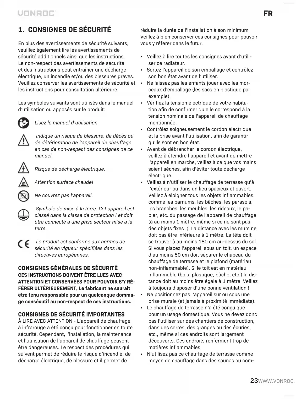 En plus des avertissements de sécurité suivants, veuillez également lire les avertissements de sécurité additionnels ainsi que les instructions. Le non-respect des avertissements de sécurité et des instructions peut entraîner une décharge électrique, un incendie et/ou des blessures graves. Veuillez conserver les avertissements de sécurité et les instructions pour consultation ultérieure. Les symboles suivants sont utilisés dans le manuel d’utilisation ou apposés sur le produit: Lisez le manuel d’utilisation. Indique un risque de blessure, de décès ou de détérioration de l’appareil de chauffage en cas de non-respect des consignes de ce manuel. Risque de décharge électrique. Attention surface chaude! Ne couvrez pas l’appareil. Symbole de mise à la terre. Cet appareil est classé dans la classe de protection I et doit être connecté à une prise secteur mise à la terre. Le produit est conforme aux normes de sécurité en vigueur spécifiées dans les directives européennes. CONSIGNES GÉNÉRALES DE SÉCURITÉ