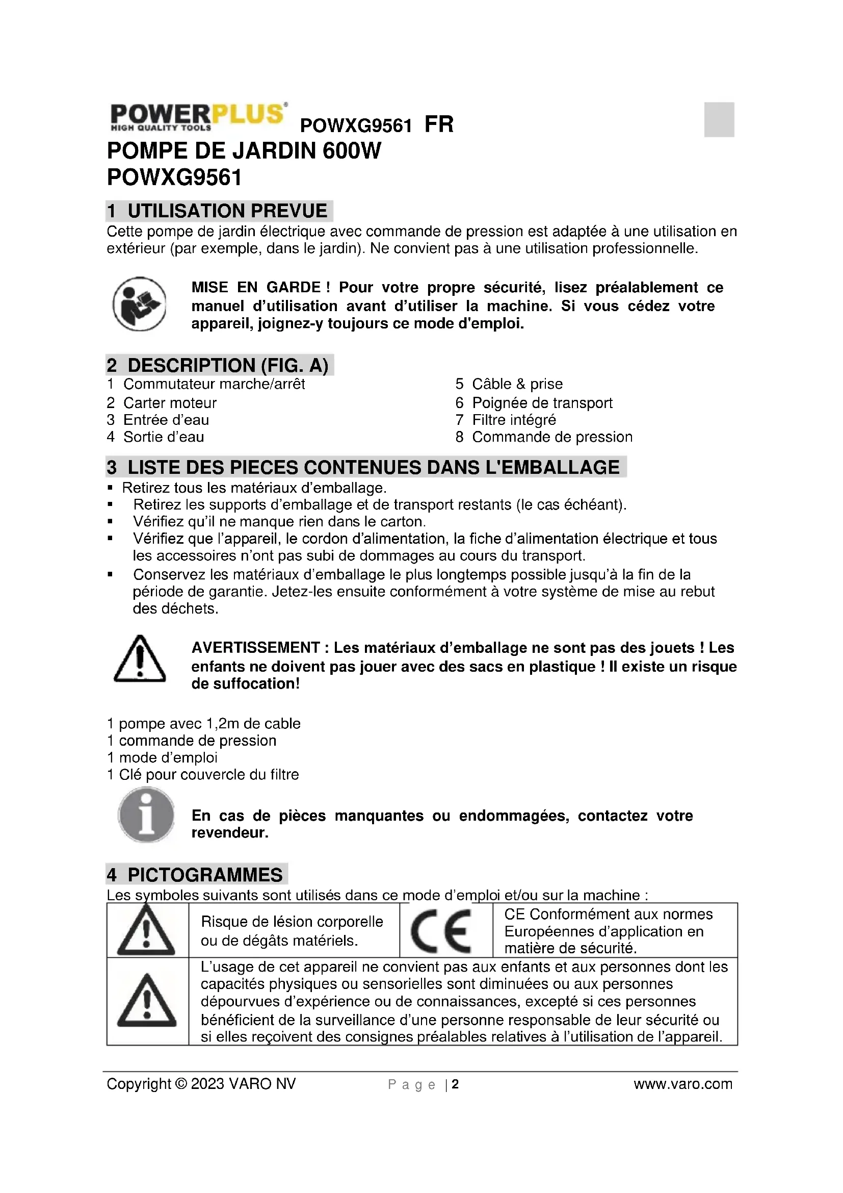 - La pompe ne doit pas fonctionner à sec, car elle risque d'être irrémédiablement endommagée.POWXG9561 FR Copyright © 2023 VARO NV P a g e | 5 www.varo.com