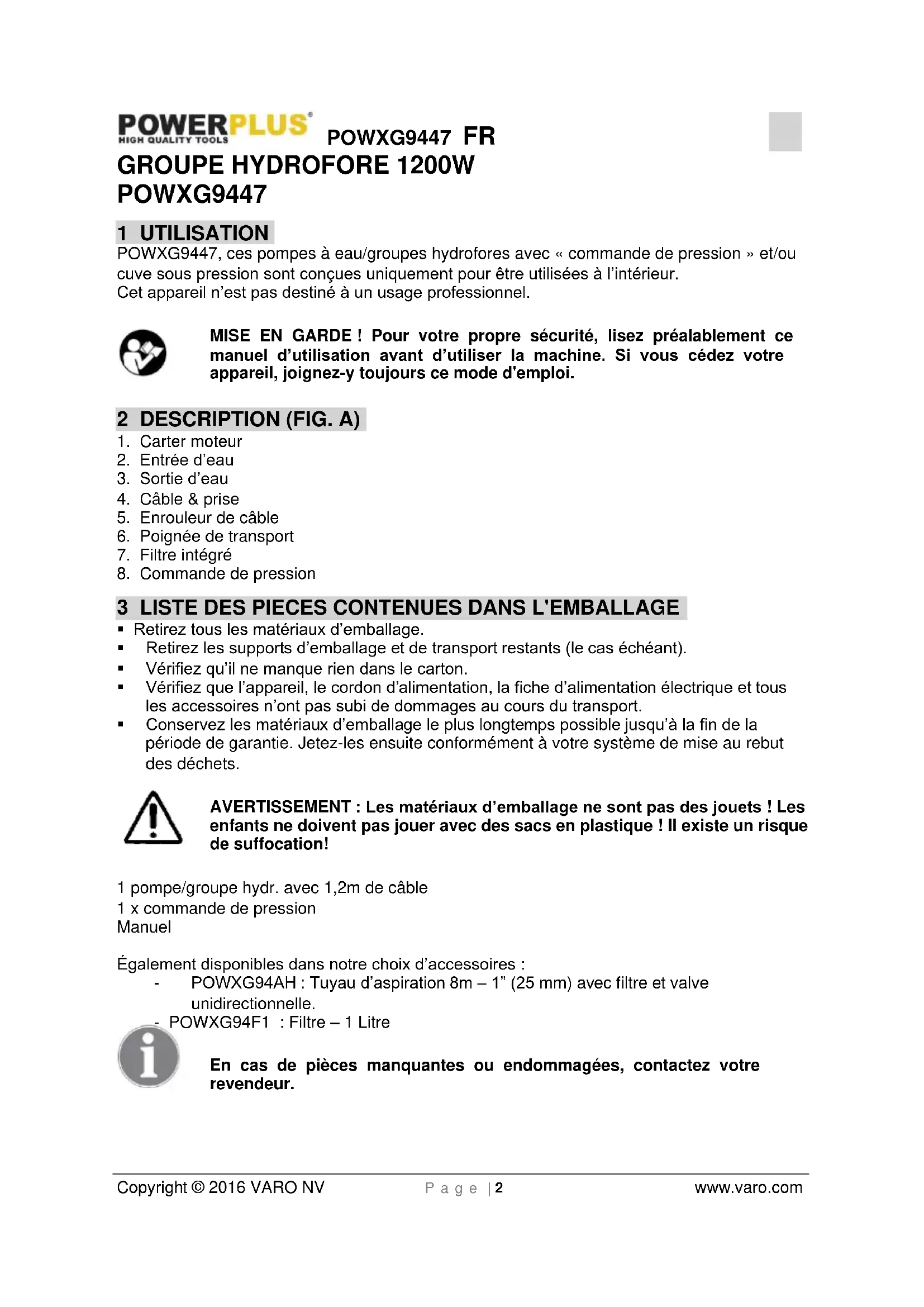 enfants ne doivent pas jouer avec des sacs en plastique ! Il existe un risque de suffocation! 1 pompe/groupe hydr. avec 1,2m de câble 1 x commande de pression Manuel Également disponibles dans notre choix d’accessoires : - POWXG94AH : Tuyau d’aspiration 8m – 1” (25 mm) avec filtre et valve unidirectionnelle. - POWXG94F1 : Filtre – 1 Litre En cas de pièces manquantes ou endommagées, contactez votre revendeur.POWXG9447 FR Copyright © 2016 VARO NV P a g e | 3 www.varo.com 4 PICTOGRAMMES Les symboles suivants sont utilisés dans ce mode d’emploi et/ou sur la machine :