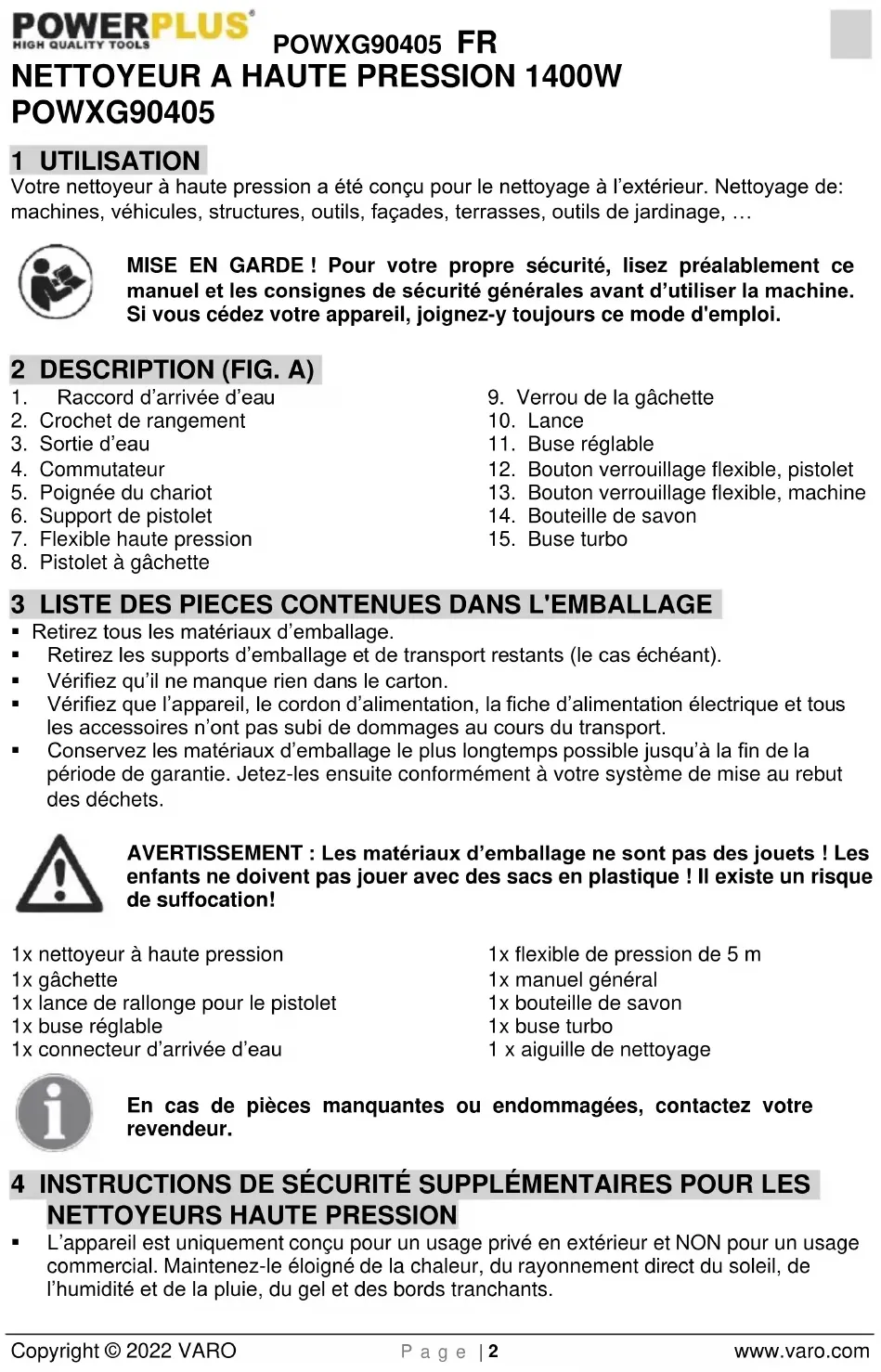 Le pistolet à gâchette et la lance subissent une poussée en fonctionnement, par conséquent, il convient de les tenir fermement à deux mains. IMPORTANT : Pointez la buse vers le sol.POWXG90405 FR Copyright © 2022 VARO P a g e | 6 www.varo.com Ce nettoyeur à haute pression est équipé d’un système de marche/arrêt automatique, basé sur la pression de l’eau.