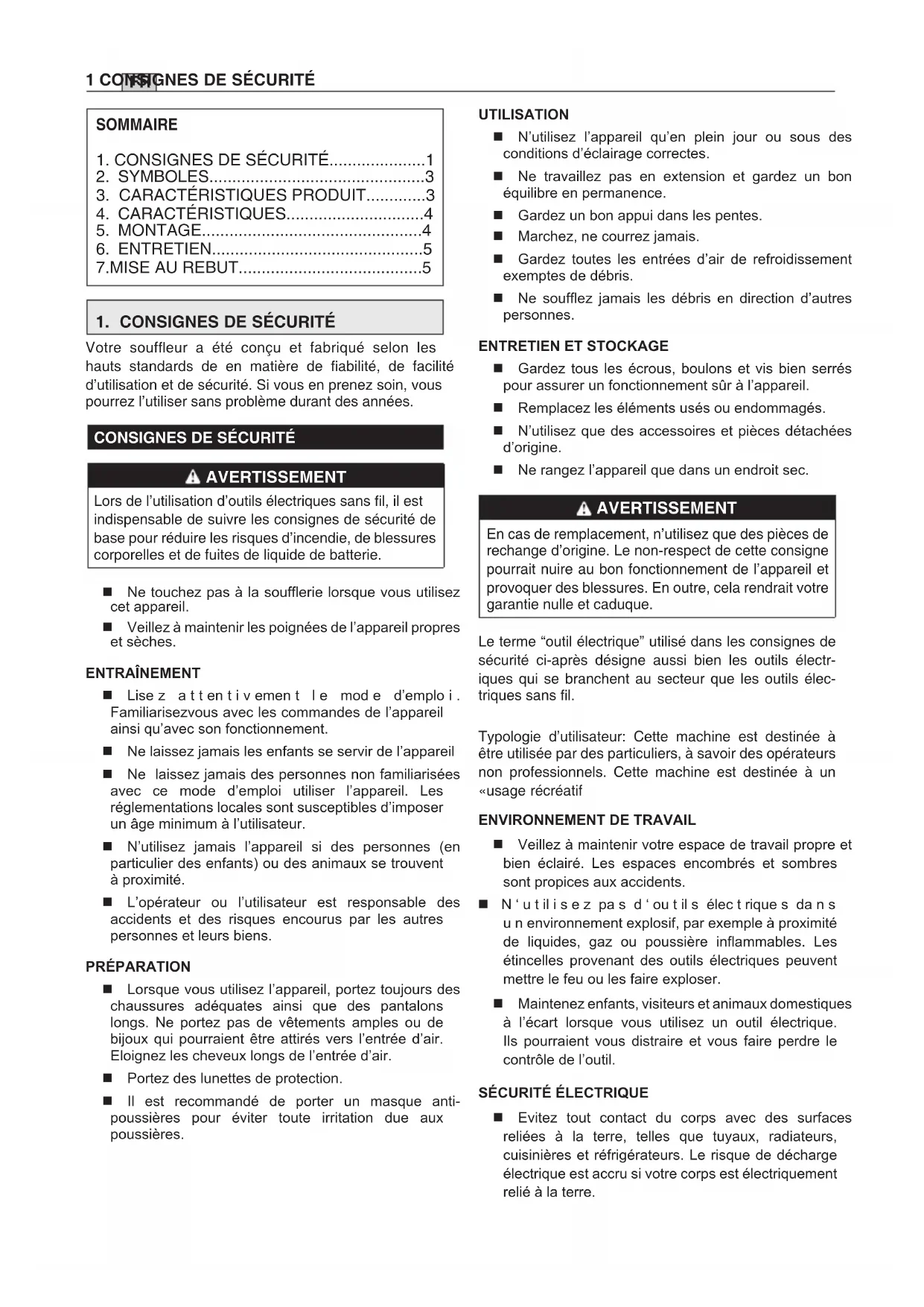 AVERTISSEMENT Lors de l’utilisation d’outils électriques sans l, il est indispensable de suivre les consignes de sécurité de base pour réduire les risques d’incendie, de blessures corporelles et de fuites de liquide de batterie. Ne touchez pas à la soufflerie lorsque vous utilisez cet appareil. Veillez à maintenir les poignées de l’appareil propres et sèches. ENTRAÎNEMENT Lise z a t t en t i v emen t l e mod e d’emplo i . Familiarisezvous avec les commandes de l’appareil ainsi qu’avec son fonctionnement. Ne laissez jamais les enfants se servir de l’appareil Ne laissez jamais des personnes non familiarisées avec ce mode d’emploi utiliser l’appareil. Les réglementations locales sont susceptibles d’imposer un âge minimum à l’utilisateur. N’utilisez jamais l’appareil si des personnes (en particulier des enfants) ou des animaux se trouvent à proximité. L’opérateur ou l’utilisateur est responsable des accidents et des risques encourus par les autres personnes et leurs biens. PRÉPARATION Lorsque vous utilisez l’appareil, portez toujours des chaussures adéquates ainsi que des pantalons longs. Ne portez pas de vêtements amples ou de bijoux qui pourraient être attirés vers l’entrée d’air. Eloignez les cheveux longs de l’entrée d’air. Portez des lunettes de protection. Il est recommandé de porter un masque anti- poussières pour éviter toute irritation due aux poussières. UTILISATION N’utilisez l’appareil qu’en plein jour ou sous des conditions d’éclairage correctes. Ne travaillez pas en extension et gardez un bon équilibre en permanence. Gardez un bon appui dans les pentes. Marchez, ne courrez jamais. Gardez toutes les entrées d’air de refroidissement exemptes de débris. Ne soufflez jamais les débris en direction d’autres personnes.