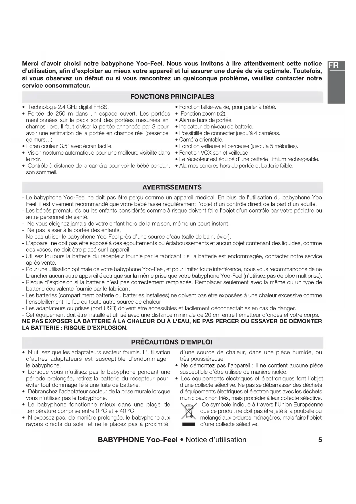 - Les équipements électriques et électroniques font l’objet d’une collecte sélective. Ne pas se débarrasser des déchets d’équipements électriques et électroniques avec les déchets municipaux non triés, mais procéder à leur collecte sélective. Ce symbole indique à travers l’Union Européenne que ce produit ne doit pas être jeté à la poubelle ou mélangé aux ordures ménagères, mais faire l’objet d’une collecte sélective. Merci d’avoir choisi notre babyphone Yoo-Feel. Nous vous invitons à lire attentivement cette notice d’utilisation, afin d’exploiter au mieux votre appareil et lui assurer une durée de vie optimale. Toutefois, si vous observez un défaut ou si vous rencontrez un quelconque problème, veuillez contacter notre service consommateur. BABYPHONE Yoo-Feel