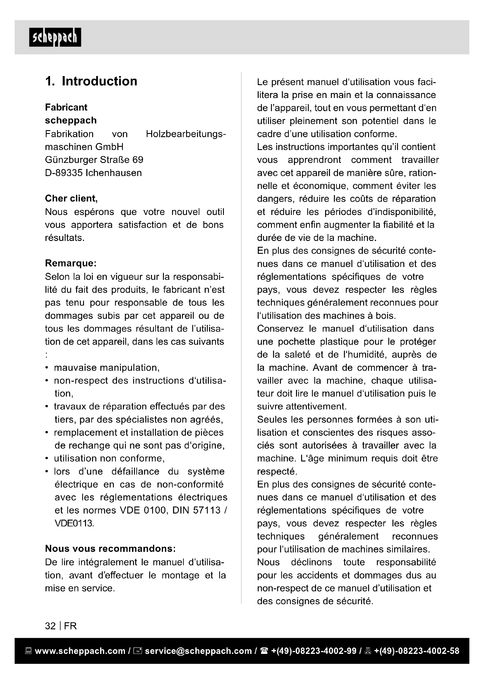 Fabricant scheppach Fabrikation von Holzbearbeitungs- maschinen GmbH Günzburger Straße 69 D-89335 Ichenhausen Cher client, Nous espérons que votre nouvel outil vous apportera satisfaction et de bons résultats. Remarque: Selon la loi en vigueur sur la responsabi- lité du fait des produits, le fabricant n’est pas tenu pour responsable de tous les dommages subis par cet appareil ou de tous les dommages résultant de l’utilisa- tion de cet appareil, dans les cas suivants