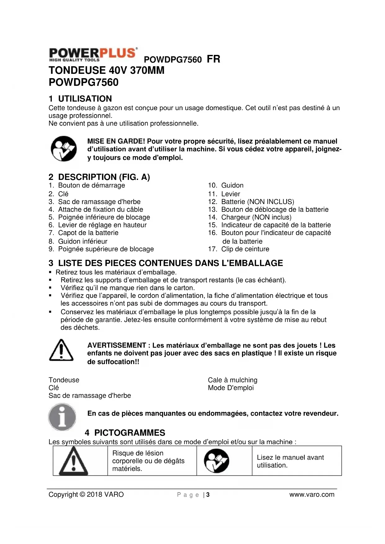 VARO N.V. - Joseph Van Instraat 9 - BE2500 Lier - BELGIQUE, déclare que : Appareil: Tondeuse Marque: POWERplus Modèle: POWDPG7560 est en conformité avec les exigences essentielles et les autres dispositions pertinentes des Directives européennes applicables, basées sur l'application des normes européennes harmonisées. Toute modification non autorisée de l'appareil annule cette déclaration. Directives européennes (y compris, le cas échéant, leurs amendements à la date de la signature) ; 2011/65/EU 2014/30/EG 2006/42/EG 2000/14/EG Annex V LwA 88dB(A) / 90dB(A) Normes européennes harmonisées (y compris, le cas échéant, leurs amendements à la date de la signature) ; EN60335-1: 2012 EN60335-2-77: 2010 EN55014-1: 2006 EN55014-2: 2015 Détenteur de la Documentation technique : Philippe Vankerkhove, VARO – Vic. Van Rompuy N.V. Le soussigné agit au nom du PDG de l'entreprise, Philippe Vankerkhove Réglementation – Directeur de la conformité Date: 06/04/2017POWDPG7560 EN Copyright © 2018 VARO P a g e | 1 www.varo.com 1 APPLICATION .................................................................................. 3