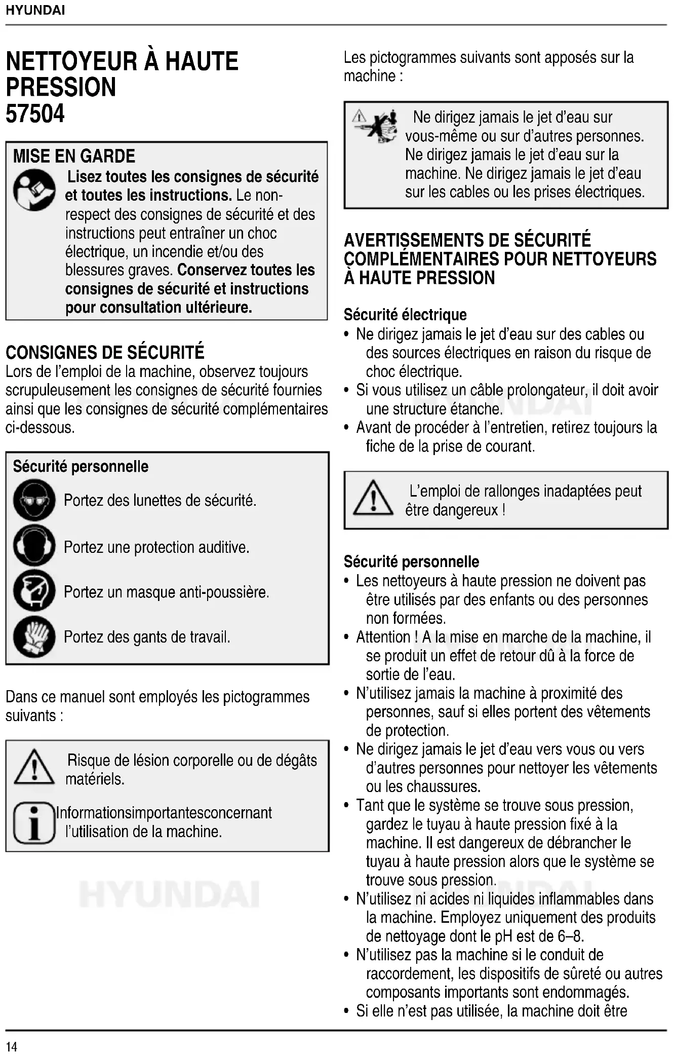 Tension du réseau V~ 230 Fréquence du réseau Hz 50 Puissance W 1.600 Pression de travail bar 90 Pression max. de travail bar 135 Consommation d’eau l/min 5,5 Pression max. de l’arrivée d’eau bar 4 Température max. de l’eau °C 50 Poids kg 8,5 GARANTIE Pour les clauses de garantie, reportez- vous aux conditions de garantie ci-jointes. ENVIRONNEMENT Votre produit, accessoires et emballages doivent être triés en vue de leur recyclage respectueux de l'environnement. Réservé aux pays de la CE Ne jetez pas les outils électriques parmi les ordures ménagères. Conformément à la directive européenne 2002/96/CE relative aux déchets d'équipements électriques et électroniques et à sa transposition dans le droit national, les outils électriques qui ne sont plus utilisables doivent être collectés séparément et éliminés dans le respect de l'environnement. Sous réserve de modifications ; les spécifications peuvent être modifiées sans notification préalable.HYUNDAI