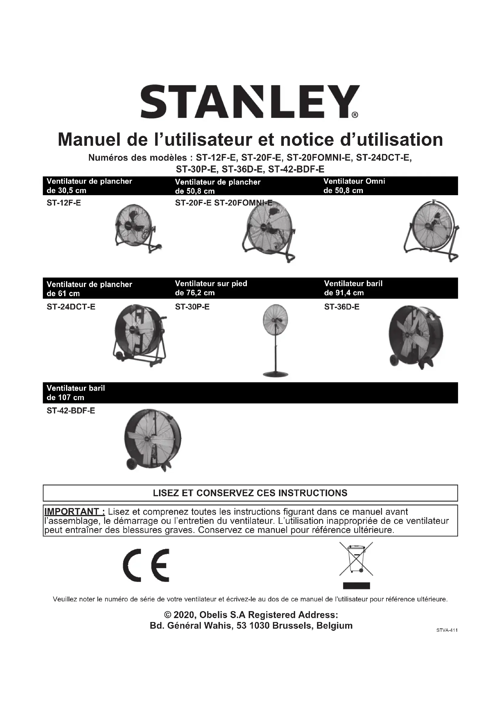 Manuel de l’utilisateur et notice d’utilisation Ventilateur de plancher de 50,8 cm Ventilateur Omni de 50,8 cm Ventilateur sur pied de 76,2 cm © 2020, Obelis S.A Registered Address: Bd. Général Wahis, 53 1030 Brussels, Belgium Ventilateur de plancher de 61 cm Ventilateur baril de 91,4 cm STVA-411 ST-12F-E