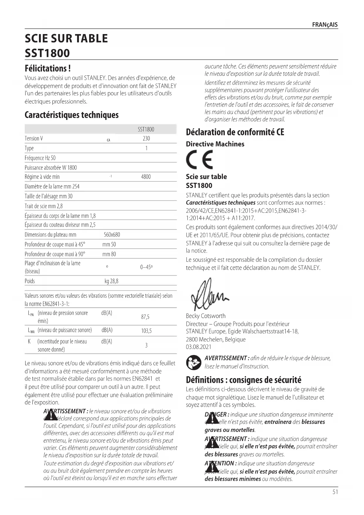 Définitions : consignes de sécurité Les définitions ci‑dessous décrivent le niveau de gravité de chaque mot signalétique. Lisez le manuel de l’utilisateur et soyez attentif à cessymboles. DANGER : indique une situation dangereuse imminente qui, si elle n’est pas évitée, entraînera des blessures graves oumortelles. AVERTISSEMENT : indique une situation dangereuse potentielle qui, si elle n’est pas évitée, pourrait entraîner des blessures graves oumortelles. ATTENTION : indique une situation dangereuse potentielle qui, si elle n’est pas évitée, pourrait entraîner des blessures minimes oumodérées. Déclaration de conformité CE Directive Machines Scie sur table SST1800 STANLEY certifient que les produits présentés dans la section Caractéristiques techniques sont conformes aux normes : 2006/42/CE, EN62841‑1:2015+AC:2015, EN62841‑3‑1:2014+AC:2015 + A11:2017.Ces produits sont également conformes aux directives 2014/30/UE et 2011/65/UE. Pour obtenir plus de précisions, contactez STANLEY à l'adresse qui suit ou consultez la dernière page de lanotice.Le soussigné est responsable de la compilation du dossier technique et il fait cette déclaration au nom deSTANLEY.Becky Cotsworth Directeur – Groupe Produits pour l'extérieur STANLEY Europe, Egide Walschaertsstraat14‑18, 2800Mechelen, Belgique 03.08.2021aucune tâche. Ces éléments peuvent sensiblement réduire le niveau d’exposition sur la durée totale detravail.Identifiez et déterminez les mesures de sécurité supplémentaires pouvant protéger l'utilisateur des effets des vibrations et/ou du bruit, comme par exemple l'entretien de l'outil et des accessoires, le fait de conserver les mains au chaud (pertinent pour les vibrations) et d'organiser les méthodes detravail.Le niveau sonore et/ou de vibrations émis indiqué dans ce feuillet d'informations a été mesuré conformément à une méthode de test normalisée établie dans par les normes EN62841