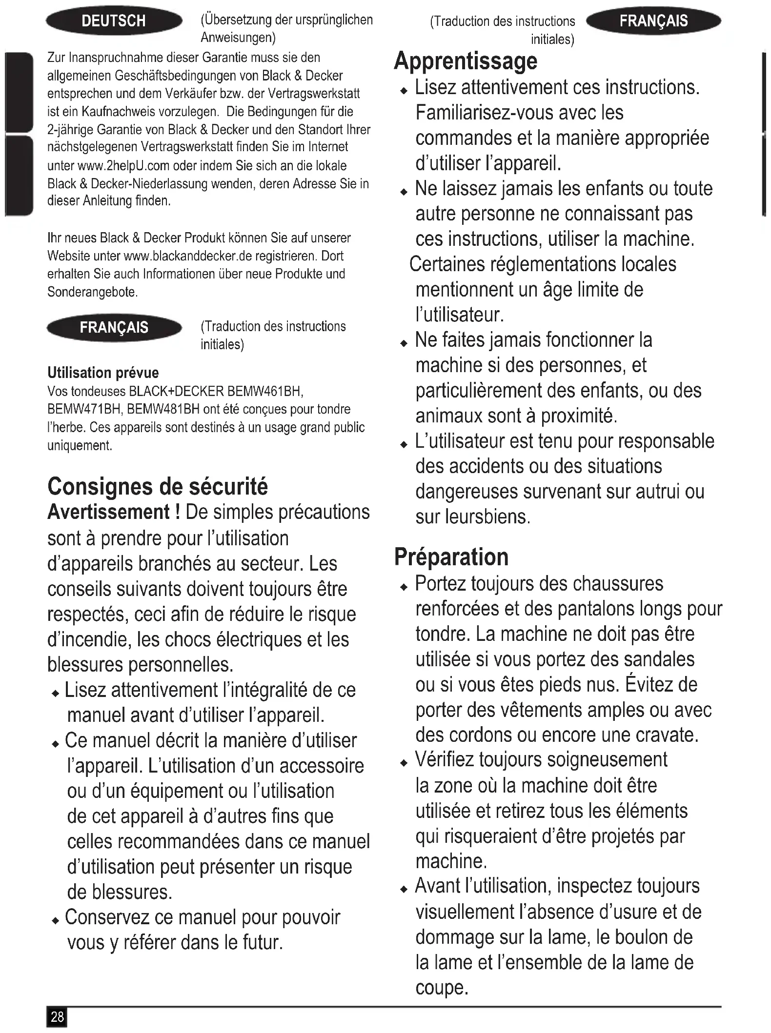 Garantie Black & Decker vertraut auf die Qualität der eigenen Geräte und bietet dem Käufer eine außergewöhnliche Garantie von 24 Monaten ab Kaufdatum. Diese Garantie versteht sich unbeschadet der gesetzlichen Gewährleistungsansprüche und schränkt diese keinesfalls ein. Diese Garantie gilt innerhalb der Staatsgebiete der Mitgliedstaaten der Europäischen Union und der Europäischen Freihandelszone.28 (Übersetzung der ursprünglichen Anweisungen) DEUTSCH (Traduction des instructions initiales) FRANÇAIS (Traduction des instructions initiales) FRANÇAIS Utilisation prévue Vos tondeuses BLACK+DECKER BEMW461BH, BEMW471BH, BEMW481BH ont été conçues pour tondre l’herbe. Ces appareils sont destinés à un usage grand public uniquement. Consignes de sécurité Avertissement ! De simples précautions sont à prendre pour l’utilisation d’appareils branchés au secteur. Les conseils suivants doivent toujours être respectés, ceci an de réduire le risque d’incendie, les chocs électriques et les blessures personnelles. u Lisez attentivement l’intégralité de ce manuel avant d’utiliser l’appareil. u Ce manuel décrit la manière d’utiliser l’appareil. L’utilisation d’un accessoire ou d’un équipement ou l’utilisation de cet appareil à d’autres ns que celles recommandées dans ce manuel d’utilisation peut présenter un risque de blessures. u Conservez ce manuel pour pouvoir vous y référer dans le futur. Apprentissage u Lisez attentivement ces instructions. Familiarisez-vous avec les commandes et la manière appropriée d’utiliser l’appareil. u Ne laissez jamais les enfants ou toute autre personne ne connaissant pas ces instructions, utiliser la machine. Certaines réglementations locales mentionnent un âge limite de l’utilisateur. u Ne faites jamais fonctionner la machine si des personnes, et particulièrement des enfants, ou des animaux sont à proximité. u L’utilisateur est tenu pour responsable des accidents ou des situations dangereuses survenant sur autrui ou sur leursbiens. Préparation u Portez toujours des chaussures renforcées et des pantalons longs pour tondre. La machine ne doit pas être utilisée si vous portez des sandales ou si vous êtes pieds nus. Évitez de porter des vêtements amples ou avec des cordons ou encore une cravate. u Vériez toujours soigneusement la zone où la machine doit être utilisée et retirez tous les éléments qui risqueraient d’être projetés par machine. u Avant l’utilisation, inspectez toujours visuellement l’absence d’usure et de dommage sur la lame, le boulon de la lame et l’ensemble de la lame de coupe. Zur Inanspruchnahme dieser Garantie muss sie den allgemeinen Geschäftsbedingungen von Black & Decker entsprechen und dem Verkäufer bzw. der Vertragswerkstatt ist ein Kaufnachweis vorzulegen. Die Bedingungen für die 2-jährige Garantie von Black & Decker und den Standort Ihrer nächstgelegenen Vertragswerkstatt nden Sie im Internet unter www.2helpU.com oder indem Sie sich an die lokale Black & Decker-Niederlassung wenden, deren Adresse Sie in dieser Anleitung nden. Ihr neues Black & Decker Produkt können Sie auf unserer Website unter www.blackanddecker.de registrieren. Dort erhalten Sie auch Informationen über neue Produkte und Sonderangebote.29 (Traduction des instructions initiales) FRANÇAIS Remplacez les composants usés ou endommagés an de maintenir un équilibre. Remplacez les étiquettes endommagées ou illisibles. u Avant l’utilisation, vériez l’état du l électrique et de la rallonge (dommages ou vieillissement). Si un câble est endommagé pendant l’utilisation, débranchez immédiatement l’appareil.