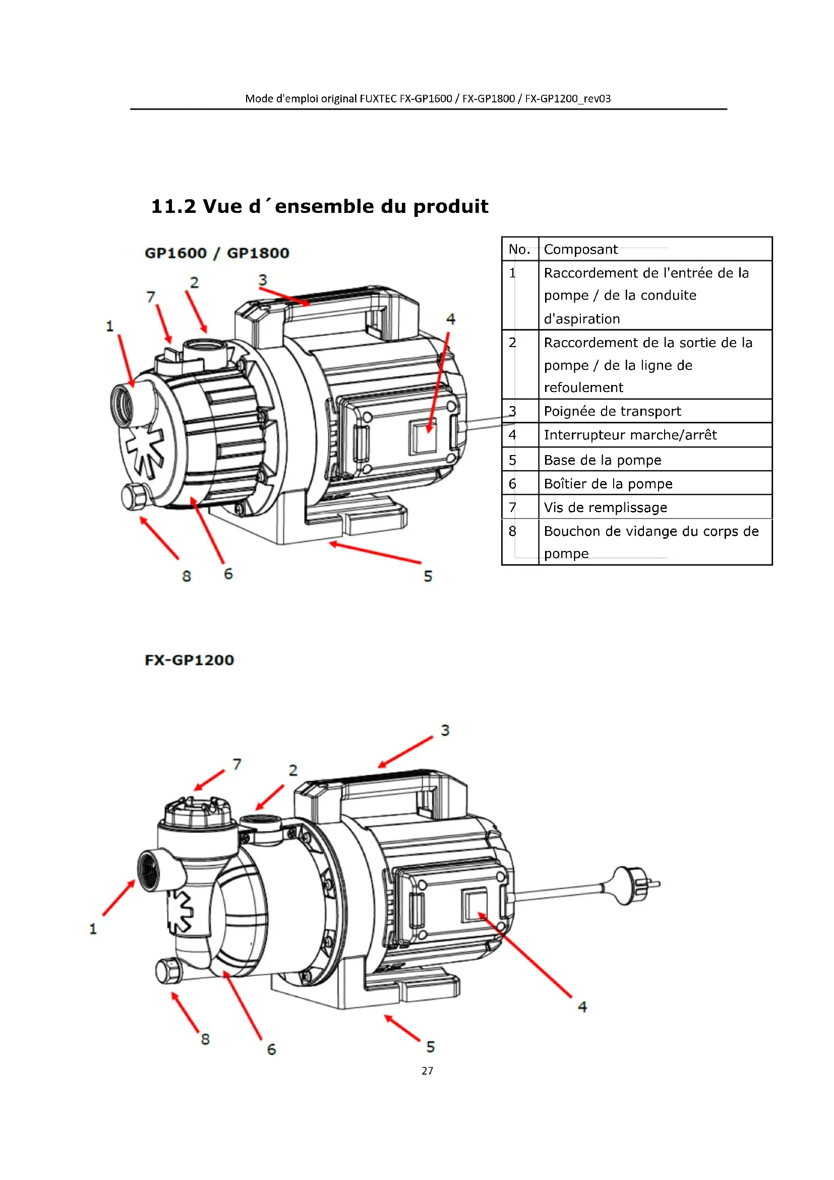 L'interrupteur thermique a mis la pompe hors service. Veuillez attendre que l'interrupteur thermique remette la pompe en service. Tenez compte de la température maximale du liquide de refoulement. Faire contrôler la pompe Pas de tension secteur disponible. Contrôler les fusibles et faites contrôler l’alimentation électrique par un électricien qualifié. La pompe est en service, mais n’achemine pas. Niveau d’eau trop bas. Plongez la conduite d’aspiration plus profondément. De l’air est contenue dans le corps de pompe. Remplir la pompe. La pompe aspire de l’air. Veuillez contrôler l’étanchéité de tous les raccordements ainsi que du couvercle de filtrage. Engorgement sur le côté d’aspiration. Attention ! Risque de brûlures dues à l’eau très chaude. Éliminez les résidus de la zone d’aspiration. Conduite de pression fermée. Attention ! Risque de brûlures dues à l’eau très chaude. Ouvrir la conduite de pression. La conduite de pression est pliée. Tendre la conduite de pression Le volume d’acheminement est insuffisant La conduite de pression est pliée. Tendre la conduite de pression. Le diamètre de la conduite est trop petit. Veuillez utiliser une conduite de pression plus grande. Engorgement sur le côté d’aspiration Veuillez prendre en compte la hauteur maximale de refoulement, voir à cet effet les caractéristiques techniques ! Hauteur d'aspiration trop élevée Contrôler la hauteur d’aspiration en tenant compte de la hauteur d’aspiration maximale → voir à cet effetMode d'emploi original FUXTEC FX-GP1600 / FX-GP1800 / FX-GP1200_rev03
