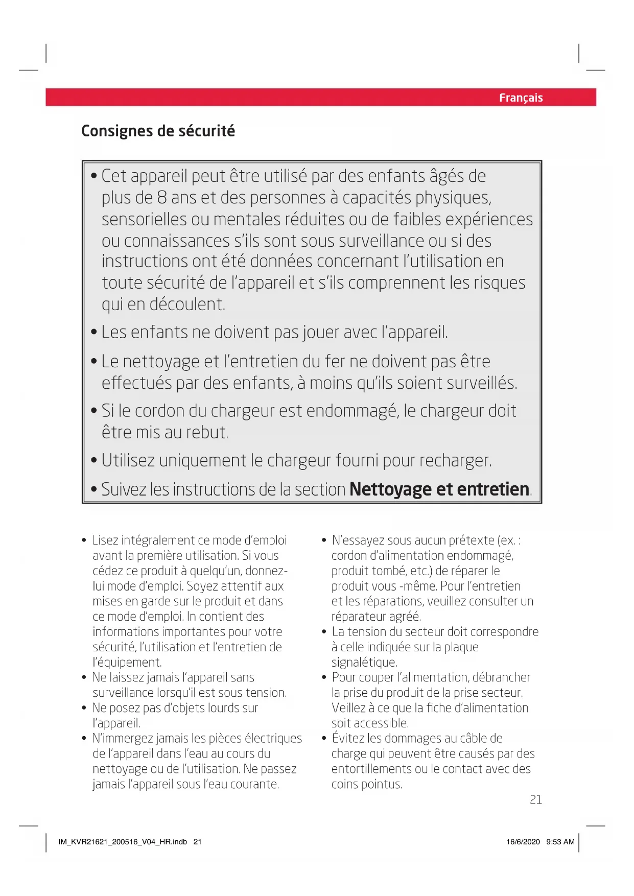 - Évitez les dommages au câble de charge qui peuvent être causés par des entortillements ou le contact avec des coins pointus. IM_KVR21621_200516_V04_HR.indb 21IM_KVR21621_200516_V04_HR.indb 21 16/6/2020 9:53 AM16/6/2020 9:53 AMSize - A5 Français