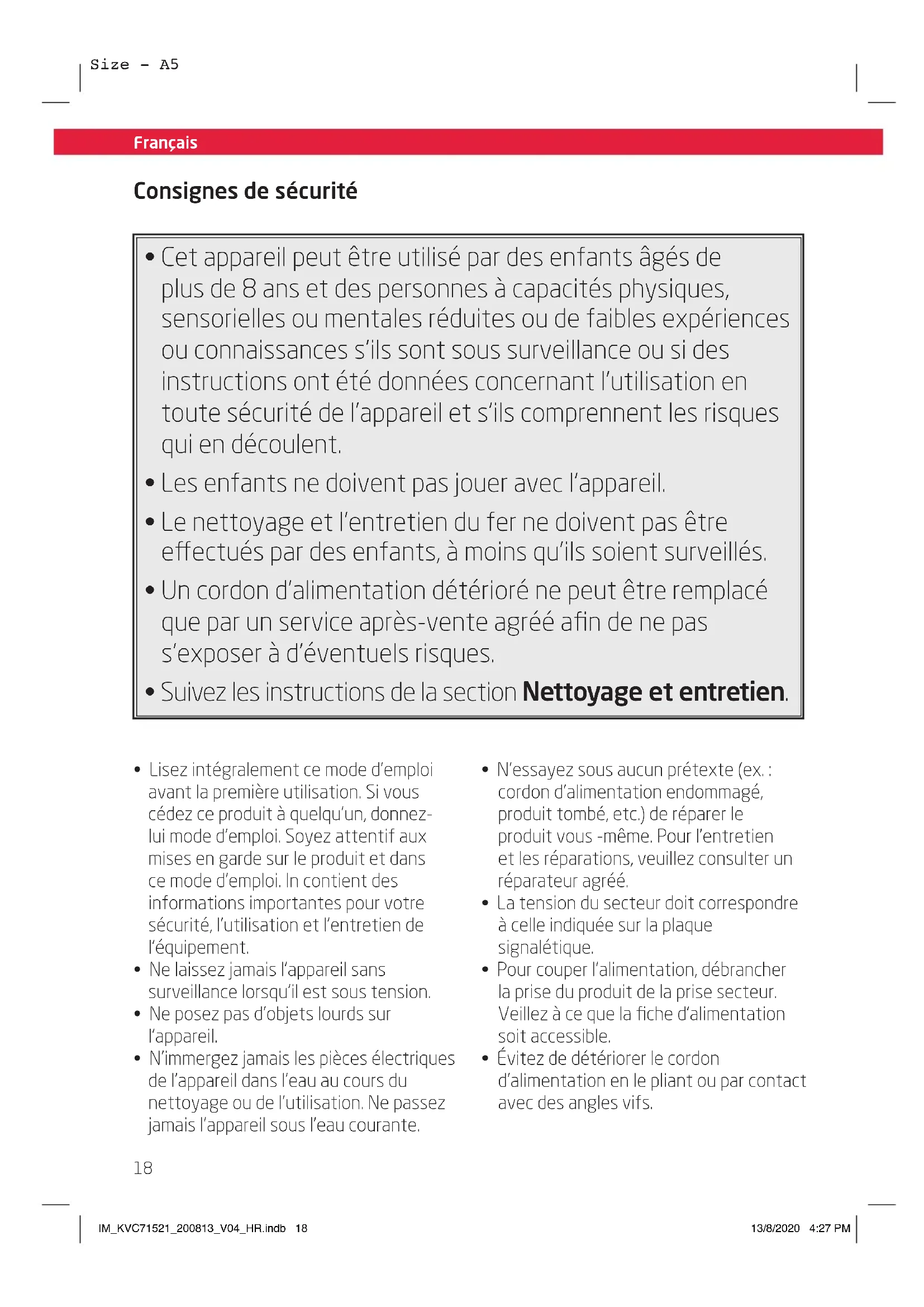 - Assurez-vous que personne ne puisse trébucher sur le câble d’alimentation. IM_KVC71521_200813_V04_HR.indb 19IM_KVC71521_200813_V04_HR.indb 19 13/8/2020 4:27 PM13/8/2020 4:27 PMSize - A5