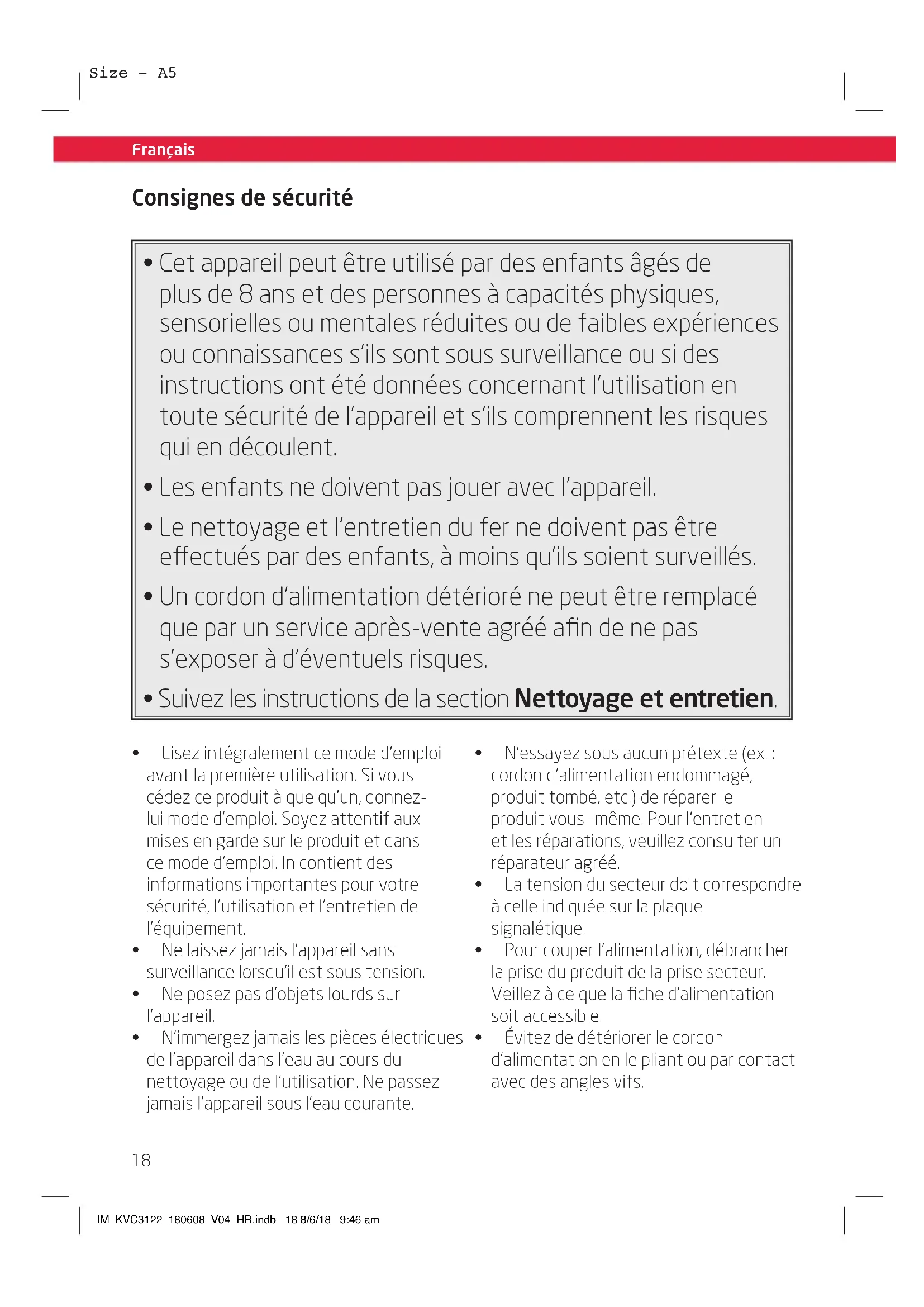 - Ne jamais plonger dans l’eau, les parties électriques de l’appareil pendant le nettoyage ou le fonctionnement. Ne jamais placer l’appareil sous l’eau courant. IM_KVC3122_180608_V04_HR.indb 21 8/6/18 9:46 amSize - A5