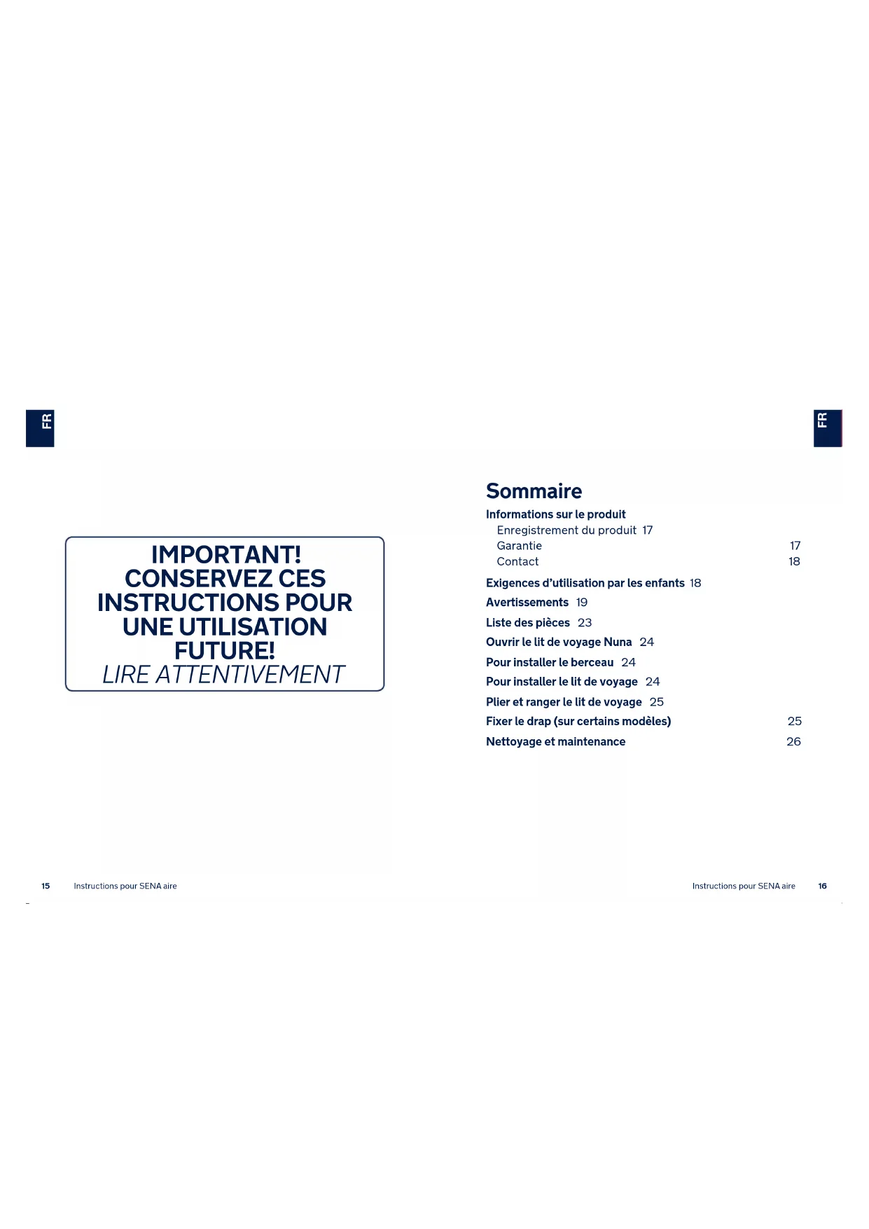 IMPORTANT! CONSERVEZ CES INSTRUCTIONS POUR UNE UTILISATION FUTURE! LIRE ATTENTIVEMENT Sommaire Informations sur le produit Enregistrement du produit 17 Garantie 17 Contact 18 Exigences d’utilisation par les enfants 18 Avertissements 19 Liste des pièces 23 Ouvrir le lit de voyage Nuna 24 Pour installer le berceau 24 Pour installer le lit de voyage 24 Plier et ranger le lit de voyage 25 Fixer le drap (sur certains modèles) 25 Nettoyage et maintenance 2617 Instructions pour SENA aire 18Instructions pour SENA aire