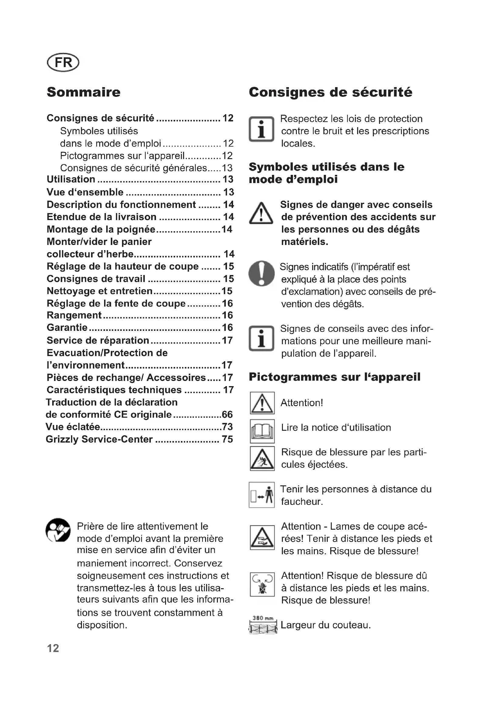 - Consignes de sécurité Respectez les lois de protection contre le bruit et les prescriptions locales. Symboles utilisés dans le mode d’emploi Signes de danger avec conseils de prévention des accidents sur les personnes ou des dégâts matériels. Signes indicatifs (l’impératif est expliqué à la place des points d’exclamation) avec conseils de pré- vention des dégâts. Signes de conseils avec des infor- mations pour une meilleure mani- pulation de l’appareil. Pictogrammes sur l‘appareil Attention! Lire la notice d‘utilisation Risque de blessure par les parti- cules éjectées. Tenir les personnes à distance du faucheur. Attention - Lames de coupe acé- rées! Tenir à distance les pieds et les mains. Risque de blessure! Attention! Risque de blessure dû à distance les pieds et les mains. Risque de blessure! Largeur du couteau. Prière de lire attentivement le mode d’emploi avant la première mise en service an d’éviter un maniement incorrect. Conservez soigneusement ces instructions et transmettez-les à tous les utilisa- teurs suivants an que les informa- tions se trouvent constamment à disposition. Sommaire Consignes de sécurité p. 12