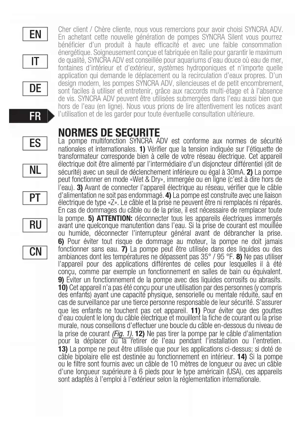CNCher client / Chère cliente, nous vous remercions pour avoir choisi SYNCRA ADV. En achetant cette nouvelle génération de pompes SYNCRA Silent vous pourrez bénéficier d’un produit à haute efficacité et avec une faible consommation énergétique. Soigneusement conçue et fabriquée en Italie pour garantir le maximum de qualité, SYNCRA ADV est conseillée pour aquariums d’eau douce où eau de mer, fontaines d’intérieur et d’extérieur, systèmes hydroponiques et n’importe quelle application qui demande le déplacement ou la recirculation d’eaux propres. D’un design modern, les pompes SYNCRA ADV, silencieuses et de petit encombrement, sont faciles à utiliser et entretenir, grâce aux raccords multi-étage et à l’absence de vis. SYNCRA ADV peuvent être utilisées submergées dans l’eau aussi bien que hors de l’eau (en ligne). Nous vous prions de lire attentivement les notices avant l’utilisation et de les garder pour toute éventuelle consultation ultérieure.