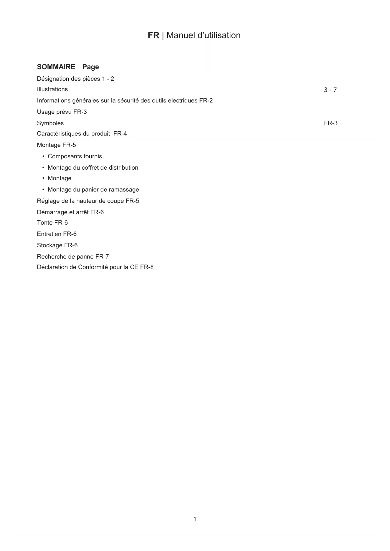 - Montage du panier de ramassage Réglage de la hauteur de coupe FR-5 Démarrage et arrêt FR-6 Tonte FR-6 Entretien FR-6 Stockage FR-6 Recherche de panne FR-7 Déclaration de Conformité pour la CE FR-8FR | Manuel d’utilisation