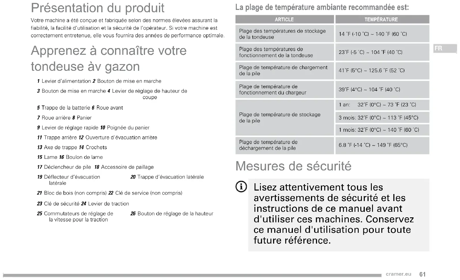 Présentation du produit Votre machine a été conçue et fabriquée selon des normes élevées assurant la fiabilité, la facilité d’utilisation et la sécurité de l’opérateur. Si votre machine est correctement entretenue, elle vous fournira des années de performance optimale. Apprenez à connaître votre tondeuse àv gazon 1 Levier d’alimentation 2 Bouton de mise en marche3 Bouton de mise en marche 4 Levier de réglage de hauteur de coupe5 Trappe de la batterie 6 Roue avant7 Roue arrière 8 Panier9 Levier de réglage rapide 10 Poignée du panier11 Trappe arrière 12 Ouverture d’évacuation arrière13 Axe de trappe 14 Crochets15 Lame 16 Boulon de lame17 Déclencheur de pile 18 Accessoire de paillage19 Déflecteur d’évacuation latérale20 Trappe d’évacuation latérale21 Bloc de bois (non compris) 22 Clé de service (non compris)23 Clé de sécurité 24 Levier de traction 25 Commutateurs de réglage de la vitesse pour la traction26 Bouton de réglage de la hauteur La plage de température ambiante recommandée est: ARTICLE TEMPÉRATUREPlage des températures de stockage de la tondeuse14 ˚F (-10 ˚C) ~ 140 ˚F (60 ˚C)Plage des températures de fonctionnement de la tondeuse23˚F (-5 ˚C) ~ 104 ˚F (40 ˚C)Plage de température de chargement de la pile41˚F (5°C) ~ 125.6 ˚F (52 ˚C)Plage de température de fonctionnement du chargeur39˚F (4°C) ~ 104 ˚F (40 ˚C)Plage de température de stockage de la pile1 an: 32˚F (0°C) ~ 73 ˚F (23 ˚C)3 mois: 32˚F (0°C) ~ 113 ˚F (45°C)1 mois: 32˚F (0°C) ~ 140 ˚F (60 ˚C)Plage de température de déchargement de la pile6.8 ˚F (-14 ˚C) ~ 149 ˚F (65°C) Mesures de sécurité Lisez attentivement tous les avertissements de sécurité et les instructions de ce manuel avant d'utiliser ces machines. Conservez ce manuel d'utilisation pour toute future référence.62 cramer.eu