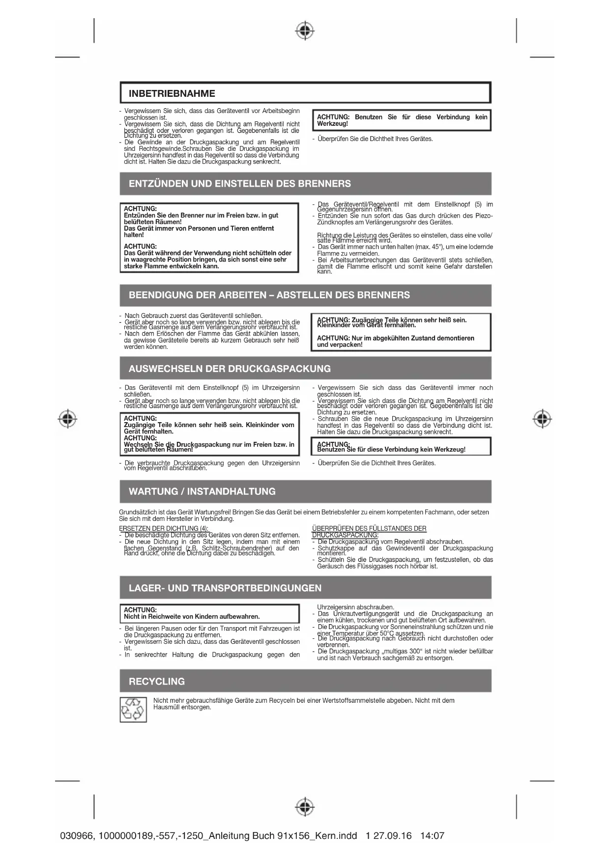 ALLUMER ET RÉGLER LE BRÛLEUR ACHEVER LES TRAVAUX - COUPER LE BRÛLEUR ATTENTION: n’allumer le brûleur qu’en plein air ou dans des pièces bien aérées! Toujours tenir l’appareil à l’écart de personnes et d’animaux! ATTENTION: ne pas secouer l’appareil, ni l’amener en position horizontale pendant l’utilisation, car une très forte flamme risque alors de se former. - Ouvrir la soupape de l’appareil/de régulation en tournant le bouton de réglage (5) dans le sens inverse des aiguilles d’une montre. - Allumer alors immédiatement le gaz en appuyant sur le bouton d’allumage piézo se trouvant sur le tube de rallonge de l’appareil. - En tournant le bouton de réglage (5) dans le sens plus (+) ou moins (-), la puissance de l’appareil peut être réglée de manière à obtenir une flamme pleine. - Toujours tenir l’appareil vers le bas (45° maxi), pour éviter que la flamme ne monte. - Toujours fermer la soupape de l’appareil pendant les arrêts de travail, pour que la flamme s’éteigne et ne constitue ainsi aucune source de danger. - Après l’utilisation, commencer par refermer la soupape de l’appareil. - Continuer d’utiliser cependant l’appareil et ne pas le déposer tant que la quantité résiduelle de gaz se trouvant dans le tube de prolongation n’a pas été consommée. - Après l’extinction de la flamme, faire refroidir l’appareil, car certains éléments de l’appareil peuvent devenir très chauds même après une courte utilisation. ATTENTION: les pièces accessibles peuvent être très chaudes. Tenir les enfants en bas âge à l’écart de l’appareil. ATTENTION: ne démonter et emballer l’appareil que lorsqu’il a refroidi! REMPLACEMENT DE LA CARTOUCHE DE GAZ SOUS PRESSION - Fermer la soupape de l’appareil en tournant le bouton de réglage (5) dans le sens des aiguilles d’une montre. - Continuer d’utiliser cependant l’appareil et ne pas le déposer tant que la quantité résiduelle de gaz se trouvant dans le tube de prolongation n’a pas été consommée. ATTENTION: les pièces accessibles peuvent être très chaudes. Tenir les enfants en bas âge à l’écart de l’appareil. ATTENTION: ne remplacer la cartouche de gaz sous pression qu’en plein air ou dans des pièces bien aérées! - Dévisser la cartouche de gaz sous pression usée de la soupape de régulation dans le sens inverse des aiguilles d’une montre. - S’assurer que la soupape de l’appareil est toujours bien fermée. - S’assurer que le joint de la soupape de régulation n’est ni endommagé, ni perdu. Le cas échéant, remplacer le joint. - Visser la nouvelle cartouche de gaz sous pression à la main et dans le sens des aiguilles d’une montre, dans la soupape de régulation, de manière à ce que l’assemblage soit étanche. Tenir pour cela la cartouche de gaz sous pression à la verticale. ATTENTION: ne pas utiliser d’outil pour ce raccord! - Vérifier l’étanchéité de l’appareil.
