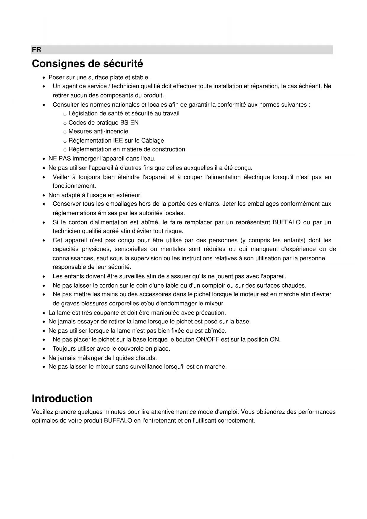 Alle rechten voorbehouden. Delen van deze instructies mogen uitsluitend worden geproduceerd of verzonden in welke vorm of via welke manier dan ook, inclusief o.a. elektronisch, mechanisch, door fotokopiëren, opnemen, met voorafgaande schriftelijke toestemming van BUFFALO. Er is alles aan gedaan om ervoor te zorgen dat de gegevens ten tijde van het afdrukken correct waren. BUFFALO behoudt zich echter het recht voor om de technische gegevens zonder mededeling te wijzigenFR Consignes de sécurité Poser sur une surface plate et stable. Un agent de service / technicien qualifié doit effectuer toute installation et réparation, le cas échéant. Ne retirer aucun des composants du produit. Consulter les normes nationales et locales afin de garantir la conformité aux normes suivantes : o Législation de santé et sécurité au travail o Codes de pratique BS EN o Mesures anti-incendie o Réglementation IEE sur le Câblage o Réglementation en matière de construction NE PAS immerger l'appareil dans l'eau. Ne pas utiliser l'appareil à d'autres fins que celles auxquelles il a été conçu. Veiller à toujours bien éteindre l'appareil et à couper l'alimentation électrique lorsqu'il n'est pas en fonctionnement. Non adapté à l'usage en extérieur. Conserver tous les emballages hors de la portée des enfants. Jeter les emballages conformément aux réglementations émises par les autorités locales. Si le cordon d'alimentation est abîmé, le faire remplacer par un représentant BUFFALO ou par un technicien qualifié agréé afin d'éviter tout risque. Cet appareil n'est pas conçu pour être utilisé par des personnes (y compris les enfants) dont les capacités physiques, sensorielles ou mentales sont réduites ou qui manquent d'expérience ou de connaissances, sauf sous la supervision ou les instructions relatives à son utilisation par la personne responsable de leur sécurité. Les enfants doivent être surveillés afin de s'assurer qu'ils ne jouent pas avec l'appareil. Ne pas laisser le cordon sur le coin d'une table ou d'un comptoir ou sur des surfaces chaudes. Ne pas mettre les mains ou des accessoires dans le pichet lorsque le moteur est en marche afin d'éviter de graves blessures corporelles et/ou d'endommager le mixeur. La lame est très coupante et doit être manipulée avec précaution. Ne jamais essayer de retirer la lame lorsque le pichet est posé sur la base. Ne pas utiliser lorsque la lame n'est pas bien fixée ou est abîmée. Ne pas placer le pichet sur la base lorsque le bouton ON/OFF est sur la position ON. Toujours utiliser avec le couvercle en place. Ne jamais mélanger de liquides chauds. Ne pas laisser le mixeur sans surveillance lorsqu'il est en marche. Introduction Veuillez prendre quelques minutes pour lire attentivement ce mode d'emploi. Vous obtiendrez des performances optimales de votre produit BUFFALO en l'entretenant et en l'utilisant correctement.Standard d'assistance téléphonique : 01 64 89 73 61 (Français) Contenu de l'emballage L'emballage contient les éléments suivants : Mixeur BUFFALO Pichet et couvercle Poussoir de sécurité BUFFALO s'enorgueillit de sa qualité et de son service, et s'assure lors de l'emballage de l'appareil que tous les composants sont fournis en bon état de fonctionnement et intacts. Si vous venez à trouver des dommages résultant du transport, veuillez immédiatement contacter votre revendeur BUFFALO. Emplacement des commandes