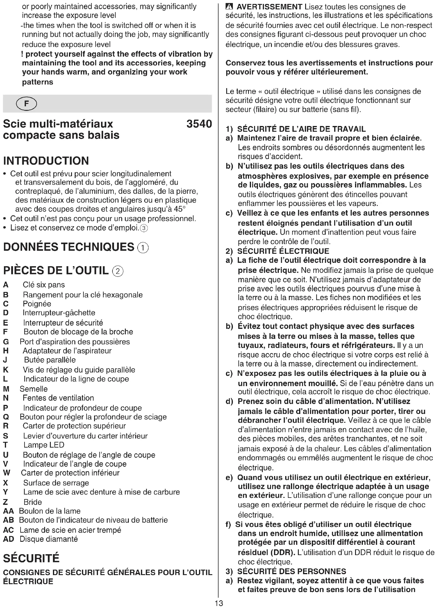 - Plunge cutting y - set desired cutting depth - tilt tool forward with line-of-cut indicator L lined up with desired line of cut marked on the workpiece - open lower guard W with lever S - just before blade enters workpiece, switch on tool and gradually lower back end of tool using front end of foot as hinge-point - gradually move tool downward as well as forward - as soon as blade enters the material, release lever S13 - AVERTISSEMENT Lisez toutes les consignes de sécurité, les instructions, les illustrations et les spécications de sécurité fournies avec cet outil électrique. Le non-respect des consignes gurant ci-dessous peut provoquer un choc électrique, un incendie et/ou des blessures graves. Conservez tous les avertissements et instructions pour pouvoir vous y référer ultérieurement. Le terme « outil électrique » utilisé dans les consignes de sécurité désigne votre outil électrique fonctionnant sur secteur (laire) ou sur batterie (sans l).