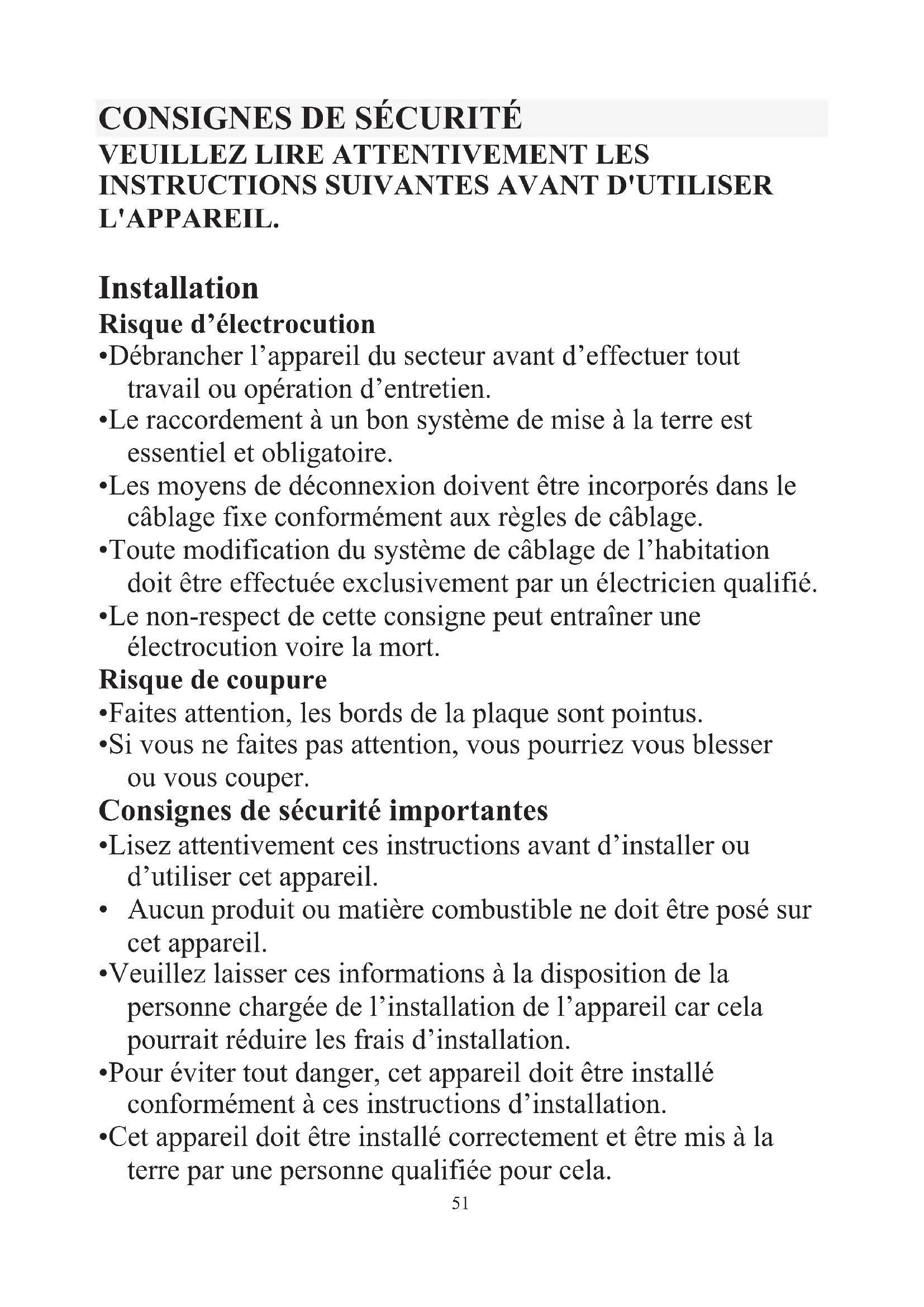 - Cet appareil doit être installé correctement et être mis à la terre par une personne qualifiée pour cela. 51• Cet appareil doit être raccordé à un circuit comprenant un sectionneur garantissant une déconnexion complète de l’alimentation.