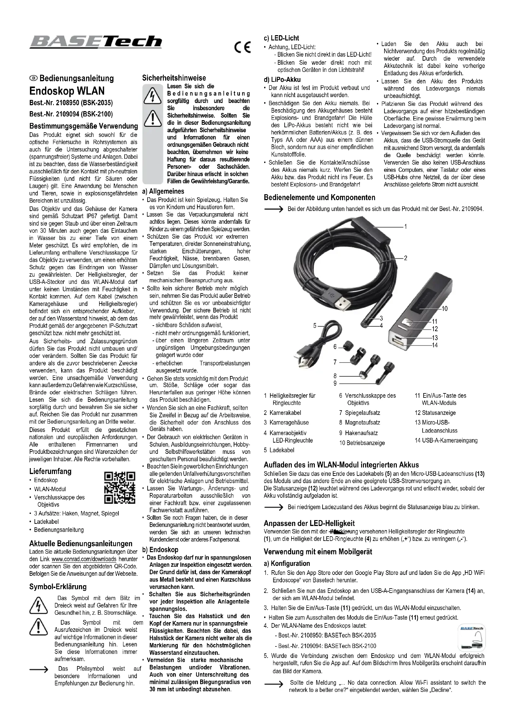 à l’écran. Si le message suivant apparaît : « ... No data connection. Allow Wi-Fi assistant to switch the network to a better one? », sélectionnez « Decline ». Mode d’emploi Endoscope Wi-Fi N° de commande 2108950 (BSK-2035) N° de commande 2109094 (BSK-2100) Utilisation prévue Le produit convient au dépannage optique ou à l’inspection des systèmes de tuyauterie ainsi que des systèmes et installations hors tension (sans tension). La résistance à l’eau s’applique uniquement au contact avec des liquides (pas d’acides ni de solutions alcalines). Il est interdit d’utiliser le produit sur des personnes, des animaux et dans des environnements potentiellement explosifs.L’objectif et le boîtier de la caméra ont un indice de protection IP67. Ils sont protégés contre la poussière et l’immersion dans l’eau jusqu’à une profondeur de 1 mètre pendant 30 minutes. Il est recommandé d’utiliser le bouchon d’étanchéité de la lentille fourni pour une protection accrue contre la pénétration de l’eau. Ne mouillez pas le gradateur, le connecteur USB-A ou le boîtier Wi-Fi. Le câble (entre le boîtier de la caméra et le gradateur) comporte un autocollant de niveau d’eau qui indique où commence et où s’arrête la protection IP.Pour des raisons de sécurité et d’homologation, toute restructuration et/ou modication du produit est interdite. Toute utilisation à des ns autres que celles décrites ci-dessus pourrait endommager le produit. De plus, une mauvaise utilisation pourrait entraîner des risques tels que les courts-circuits, les incendies, les chocs électriques, etc. Lisez attentivement les instructions du mode d’emploi et conservez-le dans un endroit sûr. Ne mettez ce produit à la disposition de tiers qu’avec son mode d’emploi.Ce produit est conforme aux exigences nationales et européennes en vigueur. Tous les noms d’entreprises et appellations de produits sont des marques commerciales de leurs propriétaires respectifs. Tous droits réservés. Contenu de l’emballage