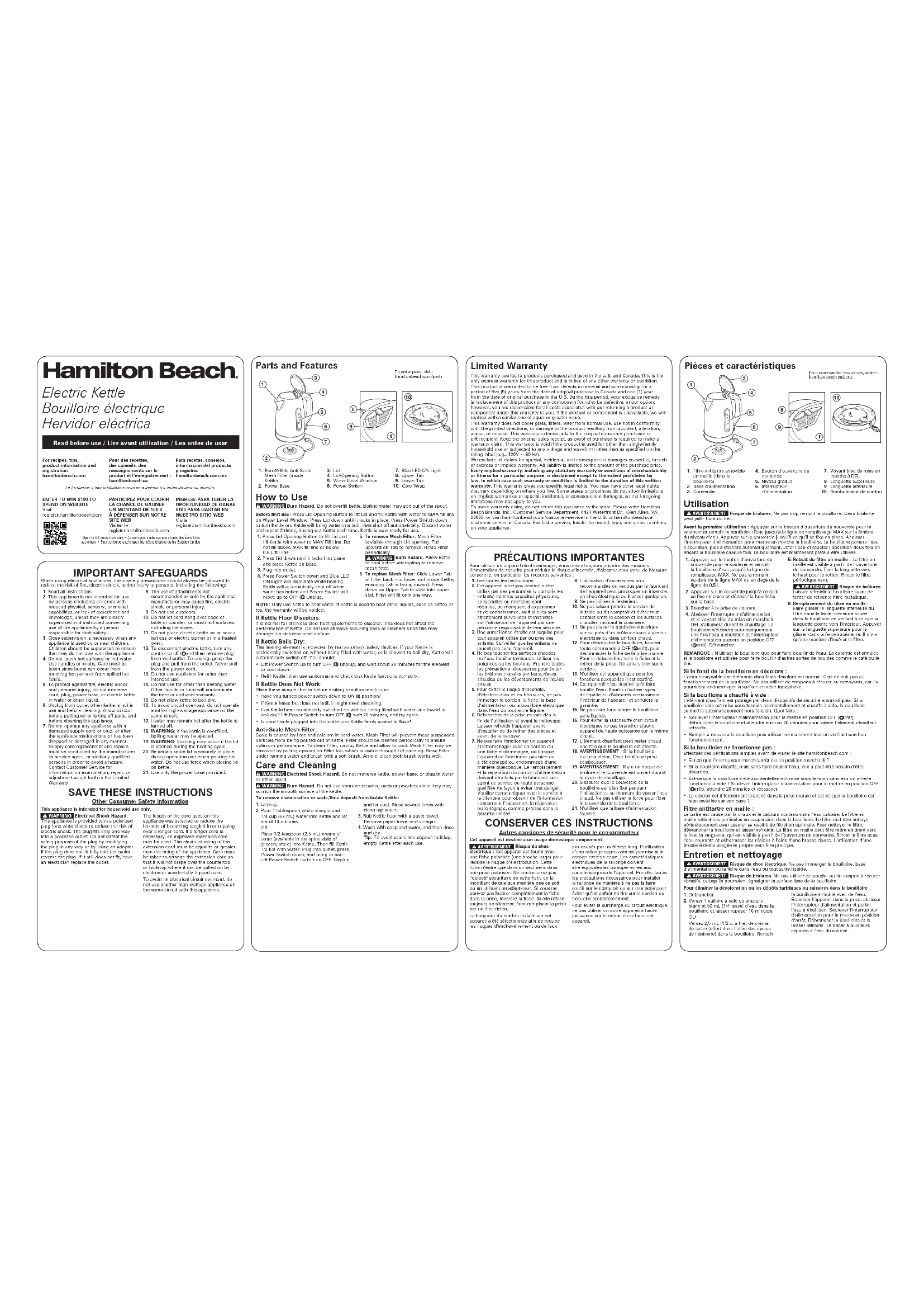 savon, puis la rincer et la sécher. Conseil : Pour éviter l’accumulation de dépôts tartriques ou calcaires, vider la bouilloire après chaque utilisation. Garantie limitée Cette garantie s’applique aux produits achetés et utilisées aux É.-U. et au Canada. C’est la seule garantie expresse pour ce produit et est en lieu et place de tout autre garantie ou condition. Ce produit est garanti contre tout défaut de matériaux et de main-d’oeuvre pour une période de cinq (5) ans à compter de la date d’achat d’origine au Canada et un (1) an à compter de la date d’achat d’origine aux É.-U. Au cours de cette période, votre recours exclusif se limitera au remplacement de ce produit ou tout autre composant défectueux, à notre discrétion. Cependant, vous êtes responsables des frais associés au retour du produit ou d’un composant en vertu de la présente garantie. Si le produit ou le composant est non disponible, nous le remplacerons avec un article similaire de valeur égale ou supérieure. Cette garantie ne couvre pas le verre, les filtres, l’usure d’un usage normal, l’utilisation non conforme aux directives imprimées, ou des dommages au produit résultant d’un accident, modification, utilisation abusive ou incorrecte. Cette garantie s’applique seulement à l’acheteur original ou à la personne l’ayant reçu en cadeau. La présentation du reçu de vente d’origine comme preuve d’achat est nécessaire pour faire une réclamation au titre de cette garantie. Cette garantie s’annule si le produit est utilisé autrement que par une famille ou si l’appareil est soumis à toute tension ou forme d’onde différente des caractéristiques nominales précisées sur l’étiquette (par ex. : 120 V ~ 60 Hz). Nous excluons toutes les réclamations au titre de cette garantie pour les dommages spéciaux, consécutifs et indirects causés par la violation de garantie expresse ou implicite. Toute responsabilité est limitée au prix d’achat. Chaque garantie implicite, y compris toute garantie ou condition de qualité marchande ou d’adéquation à un usage particulier, est exonérée, sauf dans la mesure interdite par la loi, auquel cas la garantie ou condition est limitée à la durée de cette garantie écrite. Cette garantie vous donne des droits légaux précis. Vous pouvez avoir d’autres droits qui varient selon l’endroit où vous habitez. Certaines provinces ne permettent pas les limitations sur les garanties implicites ou les dommages spéciaux ou indirects de telle sorte que les limitations ci-dessus ne s’appliquent peut-être pas à votre cas. Pour faire une réclamation au titre de la garantie, veuillez ne pas retourner cet appareil au magasin. Veuillez nous écrire à Hamilton Beach Brands, Inc., Customer Service Department, 4421 Waterfront Dr., Glen Allen, VA 23060, ou visiter le site hamiltonbeach. com/customer-service aux États-Unis ou hamiltonbeach.ca/customer-service au Canada. Pour obtenir un service plus rapide, veuillez repérer les numéros de modèle, de type et de séries sur votre appareil. SALVAGUARDIAS IMPORTANTES Cuando utilice aparatos eléctricos, siempre deben seguirse precauciones de seguridad básicas a fin de reducir el riesgo de incendio, descarga eléctrica, y/o lesiones a personas, incluyendo las siguientes: