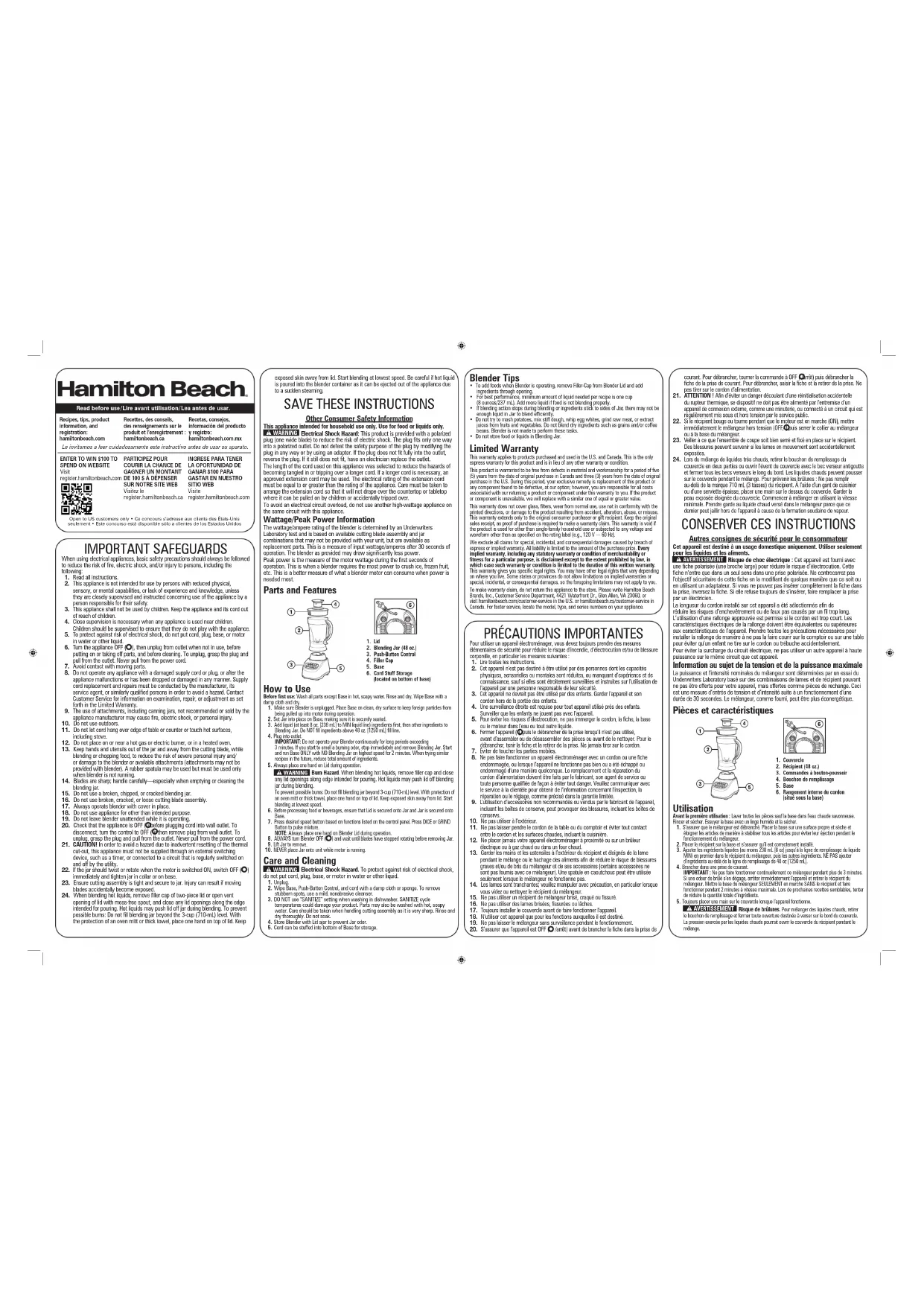 - Pour ajouter des aliments lorsque le mélangeur fonctionne, retirer le bouchon de remplissage du couvercle du mélangeur et ajouter les ingrédients par l’ouverture.• Une recette contenant une quantité minimale de 237 mL (8 oz) est nécessaire pour un rendement optimal. Ajouter du liquide si les aliments ne se mélangent pas correctement.• Si le processus de mélange cesse pendant le fonctionnement ou que les ingrédients collent aux parois du récipient, il faudra peut-être ajouter du liquide dans le récipient pour obtenir un mélange efficace.• Ne pas tenter de piler les pommes de terre, les mélanges de pâtes massives, fouetter des blancs d’oeufs, broyer de la viande crue ou d’extraire des jus de fruits et de légumes. Ne pas mélanger des ingrédients secs comme des grains ou de café. Ce mélangeur n’est pas conçu pour effectuer ce type de transformation.• Ne pas stocker d’aliments ou de liquides dans le récipient du mélangeur. Garantie limitée Cette garantie s’applique aux produits achetés et utilisées aux É.-U. et au Canada. C’est la seule garantie expresse pour ce produit et est en lieu et place de tout autre garantie ou condition. Ce produit est garanti contre tout défaut de matériaux et de main-d’oeuvre pour une période de cinq (5) ans à compter de la date d’achat d’origine au Canada et trois (3) ans à compter de la date d’achat d’origine aux É.-U. Au cours de cette période, votre seul recours est la réparation ou le remplacement de ce produit ou tout composant s’avérant défectueux, à notre gré, mais vous êtes responsable de tous les coûts liés à l’expédition du produit et le retour d’un produit ou d’un composant dans le cadre de cette garantie. Si le produit ou un composant n’est plus offert, nous le remplacerons par un produit similaire de valeur égale ou supérieure.Cette garantie ne couvre pas le verre, les filtres, l’usure d’un usage normal, l’utilisation non conforme aux directives imprimées, ou des dommages au produit résultant d’un accident, modification, utilisation abusive ou incorrecte. Cette garantie s’applique seulement à l’acheteur original ou à la personne l’ayant reçu en cadeau. La présentation du reçu de vente d’origine comme preuve d’achat est nécessaire pour faire une réclamation au titre de cette garantie. Cette garantie s’annule si le produit est utilisé autrement que par une famille ou si l’appareil est soumis à toute tension ou forme d’onde différente des caractéristiques nominales précisées sur l’étiquette (par ex. : 120 V ~ 60 Hz).Nous excluons toutes les réclamations au titre de cette garantie pour les dommages spéciaux, consécutifs et indirects causés par la violation de garantie expresse ou implicite. Toute responsabilité est limitée au prix d’achat. Chaque garantie implicite, y compris toute garantie ou condition de qualité marchande ou d’adéquation à un usage particulier, est exonérée, sauf dans la mesure interdite par la loi, auquel cas la garantie ou condition est limitée à la durée de cette garantie écrite. Cette garantie vous donne des droits légaux précis. Vous pouvez avoir d’autres droits qui varient selon l’endroit où vous habitez. Certaines provinces ne permettent pas les limitations sur les garanties implicites ou les dommages spéciaux ou indirects de telle sorte que les limitations ci-dessus ne s’appliquent peut-être pas à votre cas.Pour faire une réclamation au titre de la garantie, veuillez ne pas retourner cet appareil au magasin. Veuillez nous écrire à Hamilton Beach Brands, Inc., Customer Service Department, 4421 Waterfront Dr., Glen Allen, VA 23060, ou visiter le site hamiltonbeach.com/customer-service aux États-Unis ou hamiltonbeach.ca/customer-service au Canada. Pour obtenir un service plus rapide, veuillez repérer les numéros de modèle, de type et de séries sur votre appareil. SALVAGUARDIAS IMPORTANTES Cuando utilice aparatos eléctricos, siempre deben seguirse precauciones de seguridad básicas a fin de reducir el riesgo de incendio, descarga eléctrica, y/o lesiones a personas, incluyendo las siguientes: