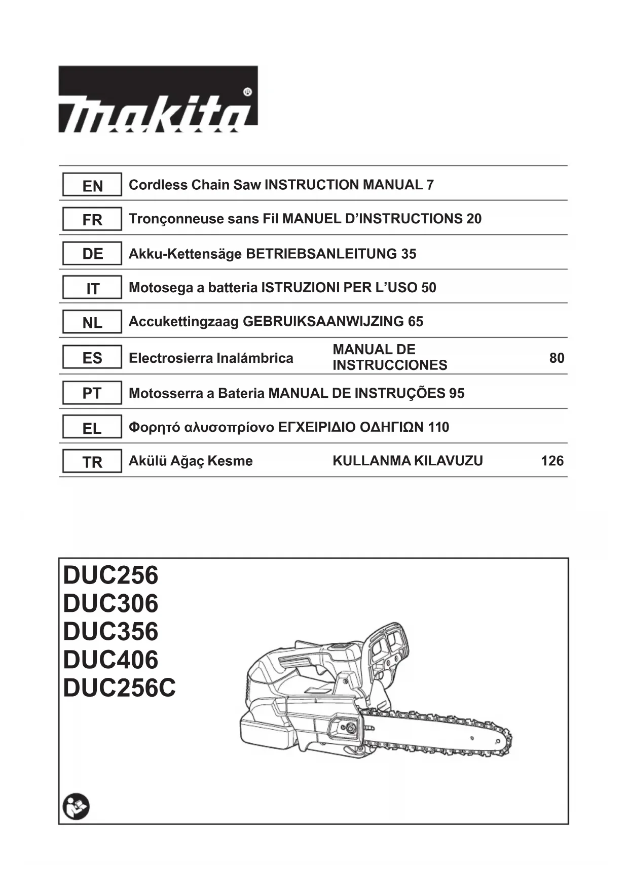 guide-chaîne dont la longueur est diérente de celle du guide-chaîne standard, achetez aussi un garde-chaîne adapté. Il doit être de la bonne taille et couvrir entièrement le guide-chaîne une fois en place. NOTE : Il se peut que certains éléments de la liste soient compris dans l’emballage de l’outil en tant qu’accessoires standard. Ils peuvent varier d’un pays àl’autre.35 DEUTSCH DEUTSCH (Original-Anleitung) TECHNISCHE DATEN Modell: DUC256 DUC306 DUC356 DUC406 DUC256C Gesamtlänge (ohne Schwert) 270 mm Nennspannung 36 V Gleichstrom Nettogewicht *1 2,8 kg *2 4,6 - 4,8 kg 4,7 - 4,9 kg 4,8 - 5,0 kg 4,8 - 5,1 kg 4,6 - 4,7 kg Standard-Schwertlänge 250 mm 300 mm 350 mm 400 mm 250 mm Empfohlene Schwertlänge mit 90PX / 91PX / M41 / M43 / 80TXL