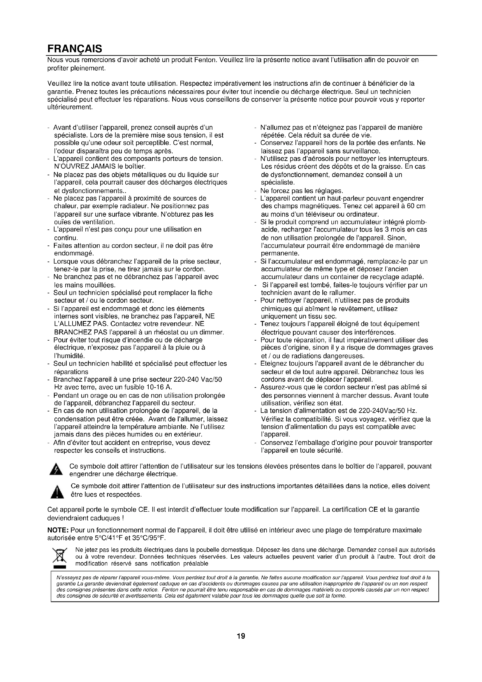 - Avant d’utiliser l’appareil, prenez conseil auprès d’un spécialiste. Lors de la première mise sous tension, il est possible qu’une odeur soit perceptible. C’est normal, l’odeur disparaîtra peu de temps après. - L’appareil contient des composants porteurs de tension. N’OUVREZ JAMAIS le boîtier. - Ne placez pas des objets métalliques ou du liquide sur l’appareil, cela pourrait causer des décharges électriques et dysfonctionnements.. - Ne placez pas l’appareil à proximité de sources de chaleur, par exemple radiateur. Ne positionnez pas l’appareil sur une surface vibrante. N’obturez pas les ouïes de ventilation. - L’appareil n’est pas conçu pour une utilisation en continu. - Faites attention au cordon secteur, il ne doit pas être endommagé. - Lorsque vous débranchez l’appareil de la prise secteur, tenez-le par la prise, ne tirez jamais sur le cordon. - Ne branchez pas et ne débranchez pas l’appareil avec les mains mouillées. - Seul un technicien spécialisé peut remplacer la fiche secteur et / ou le cordon secteur. - Si l’appareil est endommagé et donc les éléments internes sont visibles, ne branchez pas l’appareil, NE L’ALLUMEZ PAS. Contactez votre revendeur. NE BRANCHEZ PAS l’appareil à un rhéostat ou un dimmer. - Pour éviter tout risque d’incendie ou de décharge électrique, n’exposez pas l’appareil à la pluie ou à l’humidité. - Seul un technicien habilité et spécialisé peut effectuer les réparations - Branchez l’appareil à une prise secteur 220-240 Vac/50 Hz avec terre, avec un fusible 10-16 A. - Pendant un orage ou en cas de non utilisation prolongée de l’appareil, débranchez l’appareil du secteur. - En cas de non utilisation prolongée de l’appareil, de la condensation peut être créée. Avant de l’allumer, laissez l’appareil atteindre la température ambiante. Ne l’utilisez jamais dans des pièces humides ou en extérieur. - Afin d’éviter tout accident en entreprise, vous devez respecter les conseils et instructions. - N’allumez pas et n’éteignez pas l’appareil de manière répétée. Cela réduit sa durée de vie. - Conservez l’appareil hors de la portée des enfants. Ne laissez pas l’appareil sans surveillance. - N’utilisez pas d’aérosols pour nettoyer les interrupteurs. Les résidus créent des dépôts et de la graisse. En cas de dysfonctionnement, demandez conseil à un spécialiste. - Ne forcez pas les réglages. - L’appareil contient un haut-parleur pouvant engendrer des champs magnétiques. Tenez cet appareil à 60 cm au moins d’un téléviseur ou ordinateur. - Si le produit comprend un accumulateur intégré plomb- acide, rechargez l'accumulateur tous les 3 mois en cas de non utilisation prolongée de l'appareil. Sinon, l'accumulateur pourrait être endommagé de manière permanente. - Si l’accumulateur est endommagé, remplacez-le par un accumulateur de même type et déposez l’ancien accumulateur dans un container de recyclage adapté. - Si l’appareil est tombé, faites-le toujours vérifier par un technicien avant de le rallumer. - Pour nettoyer l’appareil, n’utilisez pas de produits chimiques qui abîment le revêtement, utilisez uniquement un tissu sec. - Tenez toujours l’appareil éloigné de tout équipement électrique pouvant causer des interférences. - Pour toute réparation, il faut impérativement utiliser des pièces d’origine, sinon il y a risque de dommages graves et / ou de radiations dangereuses. - Eteignez toujours l’appareil avant de le débrancher du secteur et de tout autre appareil. Débranchez tous les cordons avant de déplacer l’appareil. - Assurez-vous que le cordon secteur n’est pas abîmé si des personnes viennent à marcher dessus. Avant toute utilisation, vérifiez son état. - La tension d’alimentation est de 220-240Vac/50 Hz. Vérifiez la compatibilité. Si vous voyagez, vérifiez que la tension d’alimentation du pays est compatible avec l’appareil. - Conservez l’emballage d’origine pour pouvoir transporter l’appareil en toute sécurité. Ce symbole doit attirer l’attention de l’utilisateur sur les tensions élevées présentes dans le boîtier de l’appareil, pouvant engendrer une décharge électrique. Ce symbole doit attirer l’attention de l’utilisateur sur des instructions importantes détaillées dans la notice, elles doivent être lues et respectées. Cet appareil porte le symbole CE. Il est interdit d’effectuer toute modification sur l’appareil. La certification CE et la garantie deviendraient caduques ! NOTE: Pour un fonctionnement normal de l’appareil, il doit être utilisé en intérieur avec une plage de température maximale autorisée entre 5°C/41°F et 35°C/95°F. Ne jetez pas les produits électriques dans la poubelle domestique. Déposez-les dans une décharge. Demandez conseil aux autorisés ou à votre revendeur. Données techniques réservées. Les valeurs actuelles peuvent varier d’un produit à l’autre. Tout droit de modification réservé sans notification préalable N’essayez pas de réparer l’appareil vous-même. Vous perdriez tout droit à la garantie. Ne faites aucune modification sur l’appareil. Vous perdriez tout droit à la garantie La garantie deviendrait également caduque en cas d’accidents ou dommages causes par une utilisation inappropriée de l’appareil ou un non respect des consignes présentes dans cette notice. Fenton ne pourrait être tenu responsable en cas de dommages matériels ou corporels causés par un non respect des consignes de sécurité et avertissements. Cela est également valable pour tous les dommages quelle que soit la forme.DEBALLAGE ATTENTION ! Immédiatement après réception, vérifiez le contenu du carton et assurez-vous que tous les éléments sont bien présents et en bon état. Si besoin, faites les réserves nécessaires si le matériel ou les cartons sont endommagés. SI l’appareil doit être 
