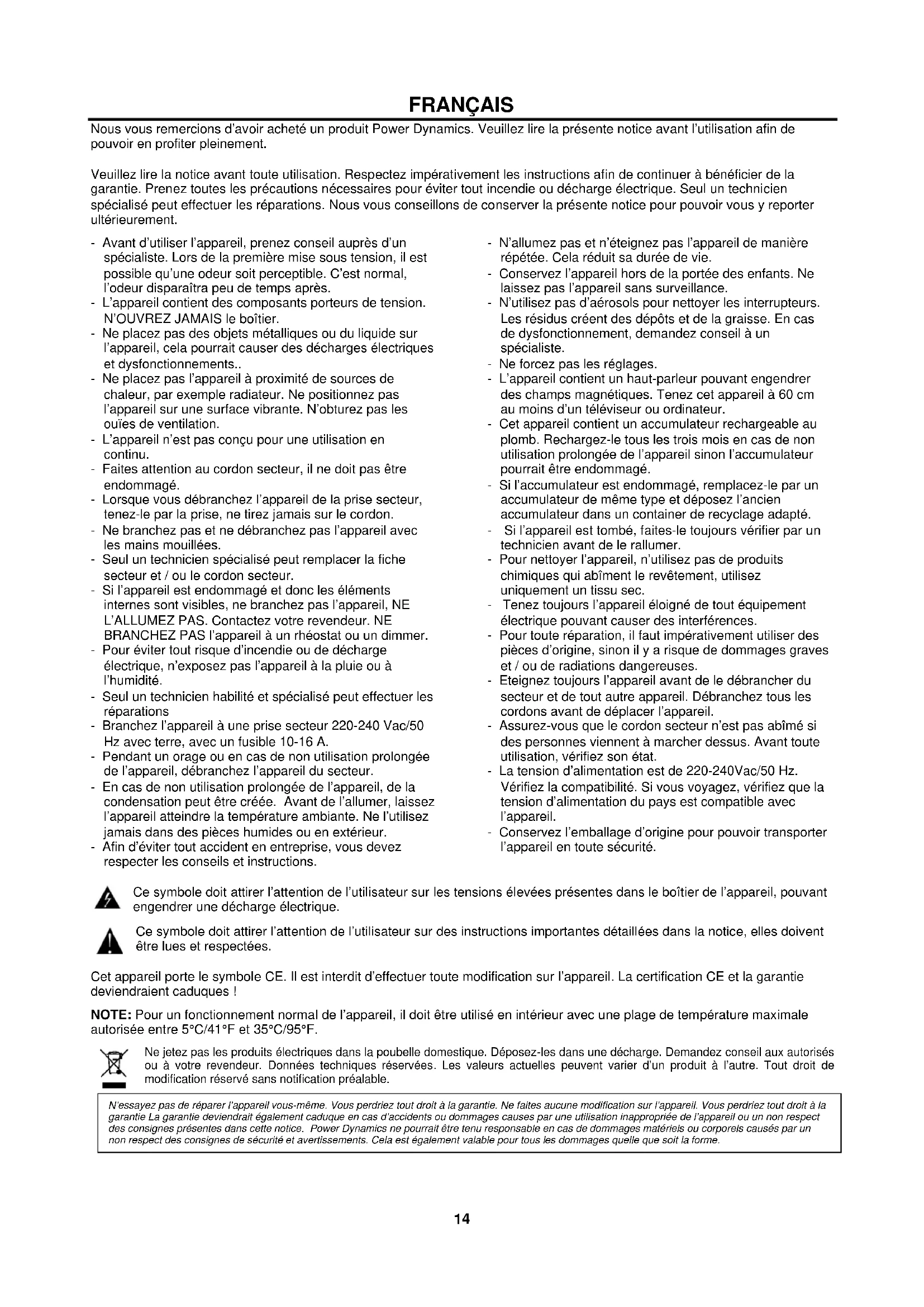 éxito, el LED se queda fijo.14 FRANÇAIS Nous vous remercions d’avoir acheté un produit Power Dynamics. Veuillez lire la présente notice avant l’utilisation afin de pouvoir en profiter pleinement. Veuillez lire la notice avant toute utilisation. Respectez impérativement les instructions afin de continuer à bénéficier de la garantie. Prenez toutes les précautions nécessaires pour éviter tout incendie ou décharge électrique. Seul un technicien spécialisé peut effectuer les réparations. Nous vous conseillons de conserver la présente notice pour pouvoir vous y reporter ultérieurement. - Avant d’utiliser l’appareil, prenez conseil auprès d’un spécialiste. Lors de la première mise sous tension, il est possible qu’une odeur soit perceptible. C’est normal, l’odeur disparaîtra peu de temps après. - L’appareil contient des composants porteurs de tension. N’OUVREZ JAMAIS le boîtier. - Ne placez pas des objets métalliques ou du liquide sur l’appareil, cela pourrait causer des décharges électriques et dysfonctionnements.. - Ne placez pas l’appareil à proximité de sources de chaleur, par exemple radiateur. Ne positionnez pas l’appareil sur une surface vibrante. N’obturez pas les ouïes de ventilation. - L’appareil n’est pas conçu pour une utilisation en continu. - Faites attention au cordon secteur, il ne doit pas être endommagé. - Lorsque vous débranchez l’appareil de la prise secteur, tenez-le par la prise, ne tirez jamais sur le cordon. - Ne branchez pas et ne débranchez pas l’appareil avec les mains mouillées. - Seul un technicien spécialisé peut remplacer la fiche secteur et / ou le cordon secteur. - Si l’appareil est endommagé et donc les éléments internes sont visibles, ne branchez pas l’appareil, NE L’ALLUMEZ PAS. Contactez votre revendeur. NE BRANCHEZ PAS l’appareil à un rhéostat ou un dimmer. - Pour éviter tout risque d’incendie ou de décharge électrique, n’exposez pas l’appareil à la pluie ou à l’humidité. - Seul un technicien habilité et spécialisé peut effectuer les réparations - Branchez l’appareil à une prise secteur 220-240 Vac/50 Hz avec terre, avec un fusible 10-16 A. - Pendant un orage ou en cas de non utilisation prolongée de l’appareil, débranchez l’appareil du secteur. - En cas de non utilisation prolongée de l’appareil, de la condensation peut être créée. Avant de l’allumer, laissez l’appareil atteindre la température ambiante. Ne l’utilisez jamais dans des pièces humides ou en extérieur. - Afin d’éviter tout accident en entreprise, vous devez respecter les conseils et instructions. - N’allumez pas et n’éteignez pas l’appareil de manière répétée. Cela réduit sa durée de vie. - Conservez l’appareil hors de la portée des enfants. Ne laissez pas l’appareil sans surveillance. - N’utilisez pas d’aérosols pour nettoyer les interrupteurs. Les résidus créent des dépôts et de la graisse. En cas de dysfonctionnement, demandez conseil à un spécialiste. - Ne forcez pas les réglages. - L’appareil contient un haut-parleur pouvant engendrer des champs magnétiques. Tenez cet appareil à 60 cm au moins d’un téléviseur ou ordinateur. - Cet appareil contient un accumulateur rechargeable au plomb. Rechargez-le tous les trois mois en cas de non utilisation prolongée de l’appareil sinon l’accumulateur pourrait être endommagé. - Si l’accumulateur est endommagé, remplacez-le par un accumulateur de même type et déposez l’ancien accumulateur dans un container de recyclage adapté. - Si l’appareil est tombé, faites-le toujours vérifier par un technicien avant de le rallumer. - Pour nettoyer l’appareil, n’utilisez pas de produits chimiques qui abîment le revêtement, utilisez uniquement un tissu sec. - Tenez toujours l’appareil éloigné de tout équipement électrique pouvant causer des interférences. - Pour toute réparation, il faut impérativement utiliser des pièces d’origine, sinon il y a risque de dommages graves et / ou de radiations dangereuses. - Eteignez toujours l’appareil avant de le débrancher du secteur et de tout autre appareil. Débranchez tous les cordons avant de déplacer l’appareil. - Assurez-vous que le cordon secteur n’est pas abîmé si des personnes viennent à marcher dessus. Avant toute utilisation, vérifiez son état. - La tension d’alimentation est de 220-240Vac/50 Hz. Vérifiez la compatibilité. Si vous voyagez, vérifiez que la tension d’alimentation du pays est compatible avec l’appareil. - Conservez l’emballage d’origine pour pouvoir transporter l’appareil en toute sécurité. Ce symbole doit attirer l’attention de l’utilisateur sur les tensions élevées présentes dans le boîtier de l’appareil, pouvant engendrer une décharge électrique. Ce symbole doit attirer l’attention de l’utilisateur sur des instructions importantes détaillées dans la notice, elles doivent être lues et respectées. Cet appareil porte le symbole CE. Il est interdit d’effectuer toute modification sur l’appareil. La certification CE et la garantie deviendraient caduques ! NOTE: Pour un fonctionnement normal de l’appareil, il doit être utilisé en intérieur avec une plage de température maximale autorisée entre 5°C/41°F et 35°C/95°F. Ne jetez pas les produits électriques dans la poubelle domestique. Déposez-les dans une décharge. Demandez conseil aux autorisés ou à votre revendeur. Données techniques réservées. Les valeurs actuelles peuvent varier d’un produit à l’autre. Tout droit de modification réservé sans notification préalable. N’essayez pas de réparer l’appareil vous-même. Vous perdriez tout droit à la garantie. Ne faites aucune modification sur l’appareil. Vous perdriez tout droit à la garantie La garantie deviendrait également caduque en cas d’accidents ou dommages causes par une utilisation inappropriée de l’appareil ou 