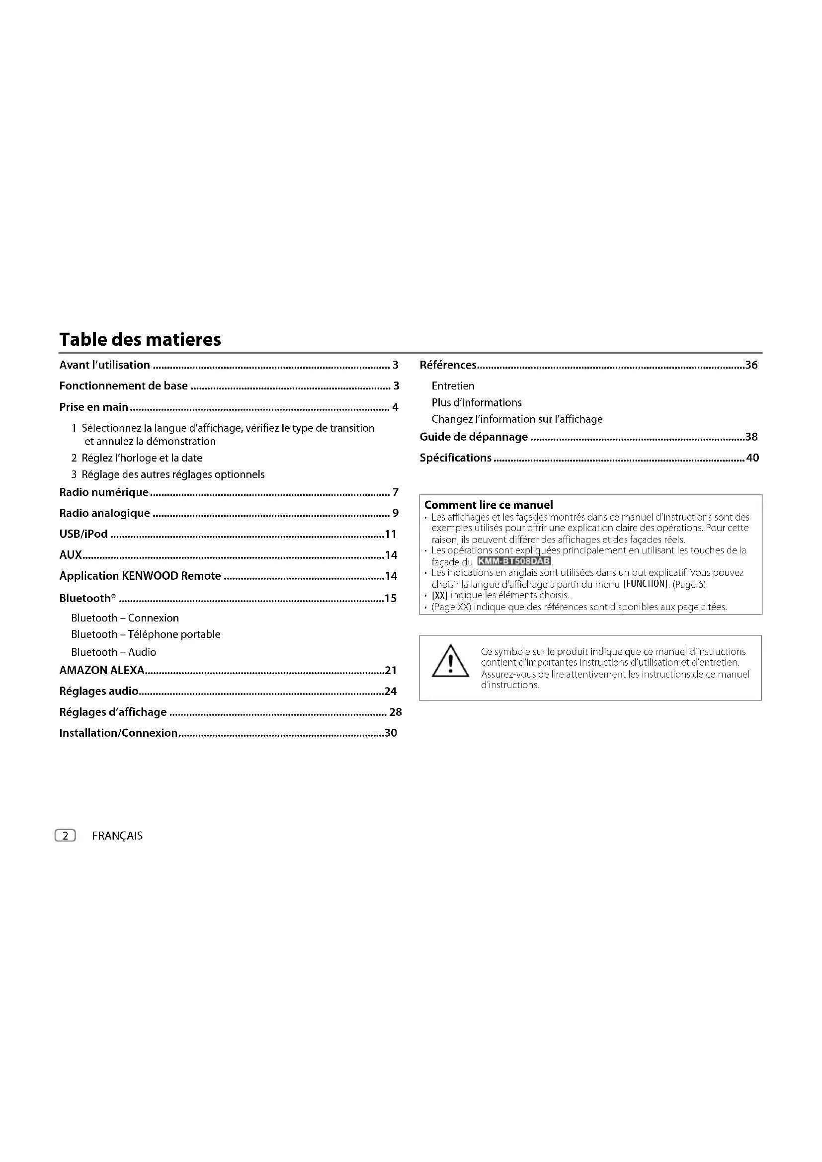 - (PageXX) indique que des références sont disponibles aux page citées. Ce symbole sur le produit indique que ce manuel d’instructions contient d’importantes instructions d’utilisation et d’entretien. Assurez-vous de lire attentivement les instructions de ce manuel d’instructions. KMM-BT508DAB_E_FR.indd 2KMM-BT508DAB_E_FR.indd 2 28/4/2022 3:22:45 PM28/4/2022 3:22:45 PMFRANÇAIS