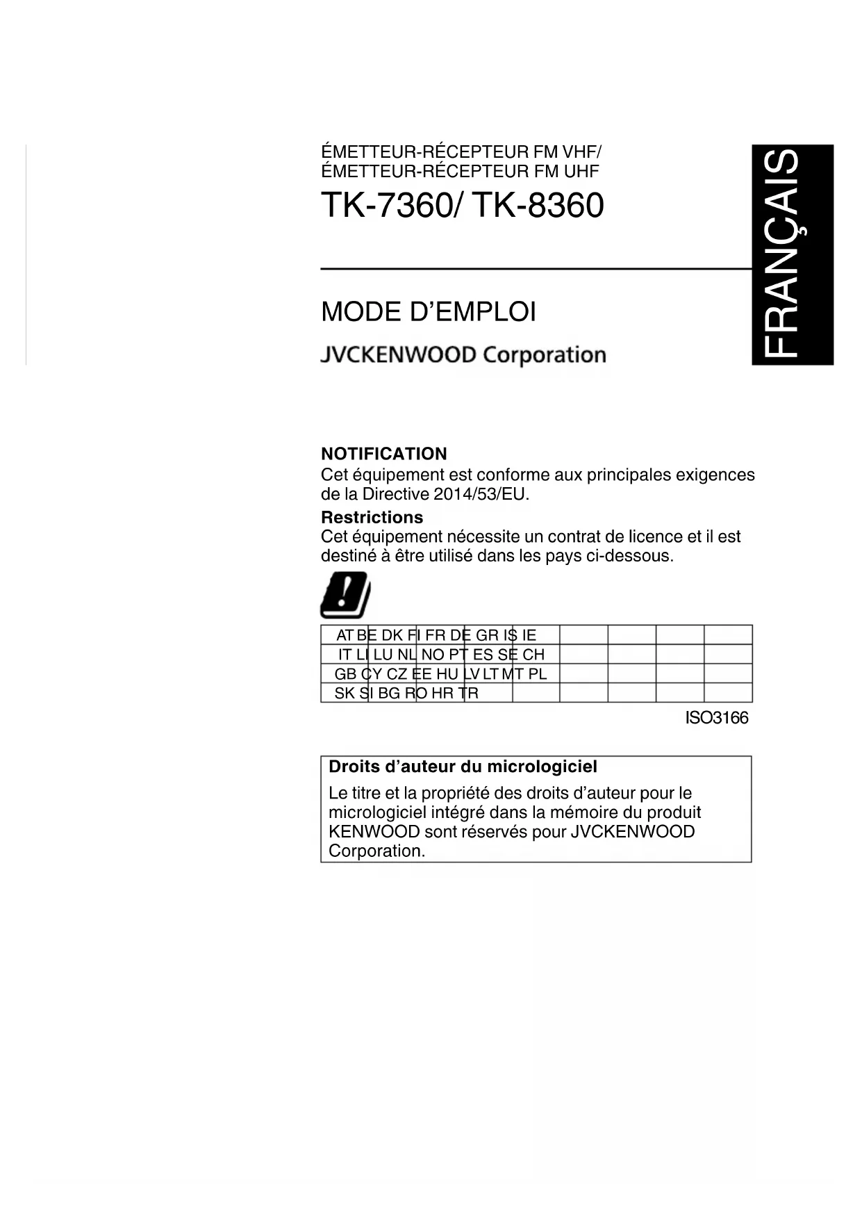 FRANÇAIS NOTIFICATION Cet équipement est conforme aux principales exigences de la Directive 2014/53/EU. Restrictions Cet équipement nécessite un contrat de licence et il est destiné à être utilisé dans les pays ci-dessous. AT BE DK FI FR DE GR IS IE IT LI LU NL NO PT ES SE CH GB CY CZ EE HU LV LT MT PL SK SI BG RO HR TR ISO3166 Droits d’auteur du micrologiciel Le titre et la propriété des droits d’auteur pour le micrologiciel intégré dans la mémoire du produit KENWOOD sont réservés pour JVCKENWOOD Corporation.Information sur l’élimination des anciens équipements électriques et électroniques et piles electriques (applicable dans les pays qui ont adopté des systèmes de collecte sélective) Les produits et piles electriques sur lesquels le pictogramme (poubelle barrée) est apposé ne peuvent pas être éliminés comme ordures ménagères. Les anciens équipements électriques et électroniques et piles electriques doivent être recyclés sur des sites capables de traiter ces produits et leurs déchets. Contactez vos autorités locales pour connaître le site de recyclage le plus proche. Un recyclage adapté et l’élimination des déchets aideront à conserver les ressources et à nous préserver des leurs effets nocifs sur notre santé et sur l’environnement.F-i MERCI Nous sommes heureux que vous ayez choisi KENWOOD pour vos applications mobiles personnelles. Ce mode d’emploi ne reprend que le fonctionnement de base de votre radio mobile. Renseignez-vous auprès de votre revendeur pour de plus amples informations relatives aux fonctions personnalisées qui ont pu être ajoutées à votre radio.