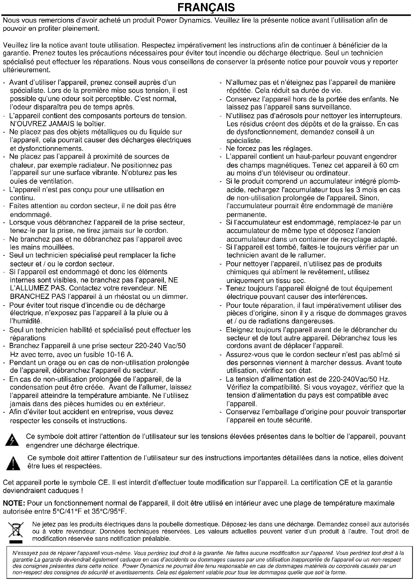 Conecte el conector del micrófono del auricular suministrado al conector de petaca. Coloque el micrófono de los auriculares aprox. 15 mm desde la apertura de su boca.FRANÇAIS Nous vous remercions d’avoir acheté un produit Power Dynamics. Veuillez lire la présente notice avant l’utilisation afin de pouvoir en profiter pleinement. Veuillez lire la notice avant toute utilisation. Respectez impérativement les instructions afin de continuer à bénéficier de la garantie. Prenez toutes les précautions nécessaires pour éviter tout incendie ou décharge électrique. Seul un technicien spécialisé peut effectuer les réparations. Nous vous conseillons de conserver la présente notice pour pouvoir vous y reporter ultérieurement. - Avant d’utiliser l’appareil, prenez conseil auprès d’un spécialiste. Lors de la première mise sous tension, il est possible qu’une odeur soit perceptible. C’est normal, l’odeur disparaîtra peu de temps après. - L’appareil contient des composants porteurs de tension. N’OUVREZ JAMAIS le boîtier. - Ne placez pas des objets métalliques ou du liquide sur l’appareil, cela pourrait causer des décharges électriques et dysfonctionnements. - Ne placez pas l’appareil à proximité de sources de chaleur, par exemple radiateur. Ne positionnez pas l’appareil sur une surface vibrante. N’obturez pas les ouïes de ventilation. - L’appareil n’est pas conçu pour une utilisation en continu. - Faites attention au cordon secteur, il ne doit pas être endommagé. - Lorsque vous débranchez l’appareil de la prise secteur, tenez-le par la prise, ne tirez jamais sur le cordon. - Ne branchez pas et ne débranchez pas l’appareil avec les mains mouillées. - Seul un technicien spécialisé peut remplacer la fiche secteur et / ou le cordon secteur. - Si l’appareil est endommagé et donc les éléments internes sont visibles, ne branchez pas l’appareil, NE L’ALLUMEZ PAS. Contactez votre revendeur. NE BRANCHEZ PAS l’appareil à un rhéostat ou un dimmer. - Pour éviter tout risque d’incendie ou de décharge électrique, n’exposez pas l’appareil à la pluie ou à l’humidité. - Seul un technicien habilité et spécialisé peut effectuer les réparations - Branchez l’appareil à une prise secteur 220-240 Vac/50 Hz avec terre, avec un fusible 10-16 A. - Pendant un orage ou en cas de non-utilisation prolongée de l’appareil, débranchez l’appareil du secteur. - En cas de non-utilisation prolongée de l’appareil, de la condensation peut être créée. Avant de l’allumer, laissez l’appareil atteindre la température ambiante. Ne l’utilisez jamais dans des pièces humides ou en extérieur. - Afin d’éviter tout accident en entreprise, vous devez respecter les conseils et instructions. - N’allumez pas et n’éteignez pas l’appareil de manière répétée. Cela réduit sa durée de vie. - Conservez l’appareil hors de la portée des enfants. Ne laissez pas l’appareil sans surveillance. - N’utilisez pas d’aérosols pour nettoyer les interrupteurs. Les résidus créent des dépôts et de la graisse. En cas de dysfonctionnement, demandez conseil à un spécialiste. - Ne forcez pas les réglages. - L’appareil contient un haut-parleur pouvant engendrer des champs magnétiques. Tenez cet appareil à 60 cm au moins d’un téléviseur ou ordinateur. - Si le produit comprend un accumulateur intégré plomb- acide, rechargez l'accumulateur tous les 3 mois en cas de non-utilisation prolongée de l'appareil. Sinon, l'accumulateur pourrait être endommagé de manière permanente. - Si l’accumulateur est endommagé, remplacez-le par un accumulateur de même type et déposez l’ancien accumulateur dans un container de recyclage adapté. - Si l’appareil est tombé, faites-le toujours vérifier par un technicien avant de le rallumer. - Pour nettoyer l’appareil, n’utilisez pas de produits chimiques qui abîment le revêtement, utilisez uniquement un tissu sec. - Tenez toujours l’appareil éloigné de tout équipement électrique pouvant causer des interférences. - Pour toute réparation, il faut impérativement utiliser des pièces d’origine, sinon il y a risque de dommages graves et / ou de radiations dangereuses. - Eteignez toujours l’appareil avant de le débrancher du secteur et de tout autre appareil. Débranchez tous les cordons avant de déplacer l’appareil. - Assurez-vous que le cordon secteur n’est pas abîmé si des personnes viennent à marcher dessus. Avant toute utilisation, vérifiez son état. - La tension d’alimentation est de 220-240Vac/50 Hz. Vérifiez la compatibilité. Si vous voyagez, vérifiez que la tension d’alimentation du pays est compatible avec l’appareil. - Conservez l’emballage d’origine pour pouvoir transporter l’appareil en toute sécurité. Ce symbole doit attirer l’attention de l’utilisateur sur les tensions élevées présentes dans le boîtier de l’appareil, pouvant engendrer une décharge électrique. Ce symbole doit attirer l’attention de l’utilisateur sur des instructions importantes détaillées dans la notice, elles doivent être lues et respectées. Cet appareil porte le symbole CE. Il est interdit d’effectuer toute modification sur l’appareil. La certification CE et la garantie deviendraient caduques ! NOTE: Pour un fonctionnement normal de l’appareil, il doit être utilisé en intérieur avec une plage de température maximale autorisée entre 5°C/41°F et 35°C/95°F. Ne jetez pas les produits électriques dans la poubelle domestique. Déposez-les dans une décharge. Demandez conseil aux autorisés ou à votre revendeur. Données techniques réservées. Les valeurs actuelles peuvent varier d’un produit à l’autre. Tout droit de modification réservée sans notification préalable.