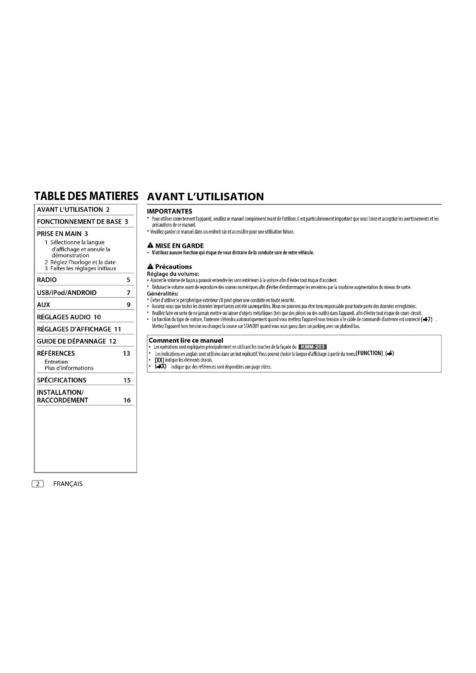 Réponse en fréquence (±1 dB) 20 Hz — 20 kHz Taux de Signal/Bruit (1 kHz) 105 dB Gamme dynamique 88 dB Séparation des canaux 90 dB Décodage MP3 Compatible avec le format MPEG-1/2 Audio Layer-3 Décodeur WMA Compatible Windows Media Audio Décodeur WAV PCM linéaire Décodeur FLAC Fichier FLAC (48kHz maximum/16bits) Audio Puissance de sortie maximum 50W×4 Pleine Puissance de Largeur de Bande 22W×4 (avec moins de 1% DHT) Impédance d’enceinte 4—8 Action en tonalité Graves 100 Hz ±8 dB Médiums 1,0kHz ±8 dB Aiguës 12,5kHz ±8 dB Niveau de préamplification/charge (USB) 2500 mV/10k Impédance du préamplificateur ≤600 Auxiliaire Réponse en fréquence (±3 dB) 20Hz—20kHz Tension maximum d’entrée 1000 mV Impédance d’entrée 30k Généralités Tension de fonctionnement 14,4V (10,5 V — 16V admissible) Consommation de courant maximale 10A Plage de températures de fonctionnement –10°C—+60°C Dimensions d’installation (L × H × P) 182 mm×53 mm×114 mm Poids net (y compris la plaque d’assemblage et le manchon de montage) 0,6kg Sujet à changement sans notification. SPÉCIFICATIONS JS_KWD_KMM_203_ENE2N_FR.indd 15JS_KWD_KMM_203_ENE2N_FR.indd 15 29/8/2016 9:51:12 AM29/8/2016 9:51:12 AM16 Data Size: B6L (182 mm x 128 mm) Book Size: B6L (182 mm x 128 mm) Avertissement